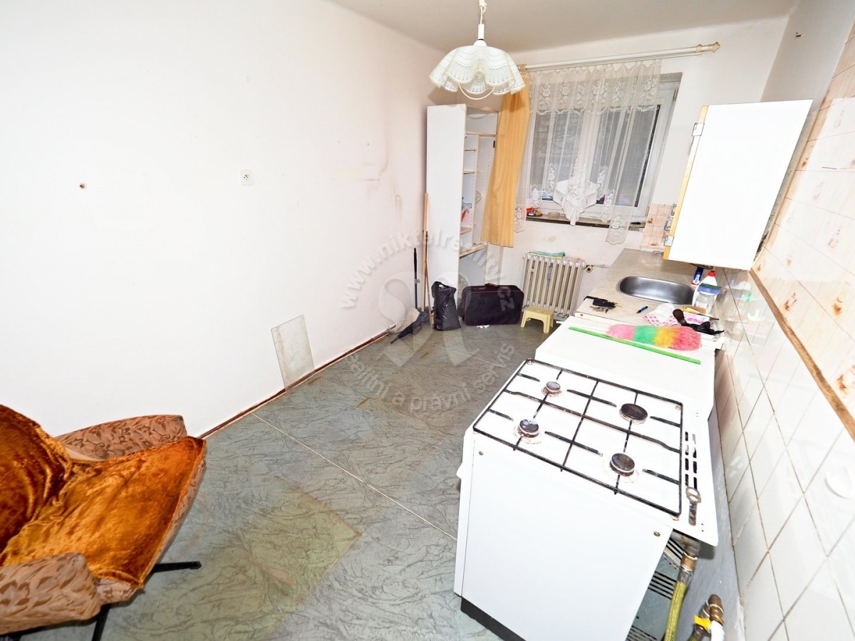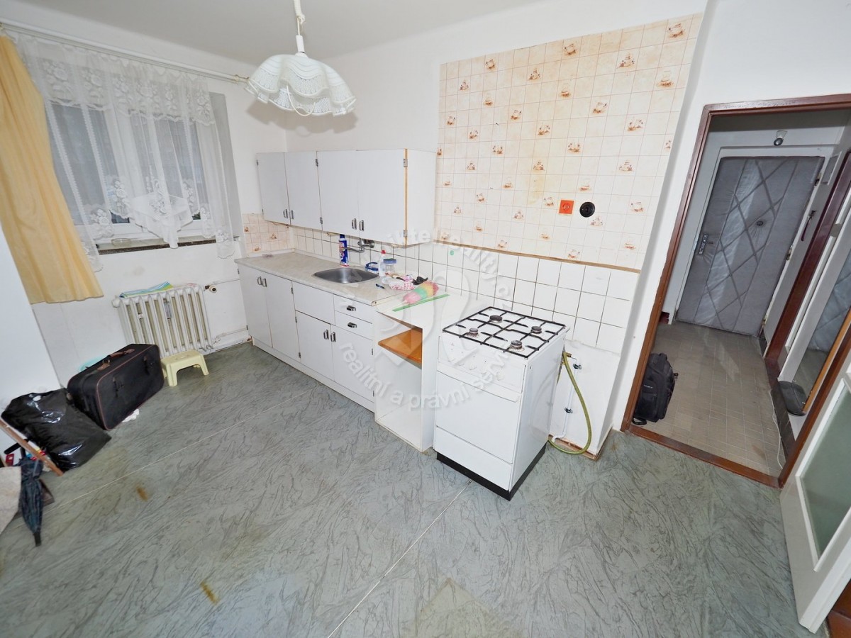 Byt je v původním, velice dobrém, udržovaném stavu. Dispozice: kuchyně s jídelnou (10, 7 m2) s osazenou kuchyňskou linkou se dřezem, volně stojícím plynovým sporákem, místem na jídelní stůl se židlemi, lednici, pračku a s přístupem na navazující obývací pokoj, na zemi v kuchyni je položeno světle šedé PVC, orientace na sever s výhledem do vnitrobloku bytových domů a na parkoviště před domem.