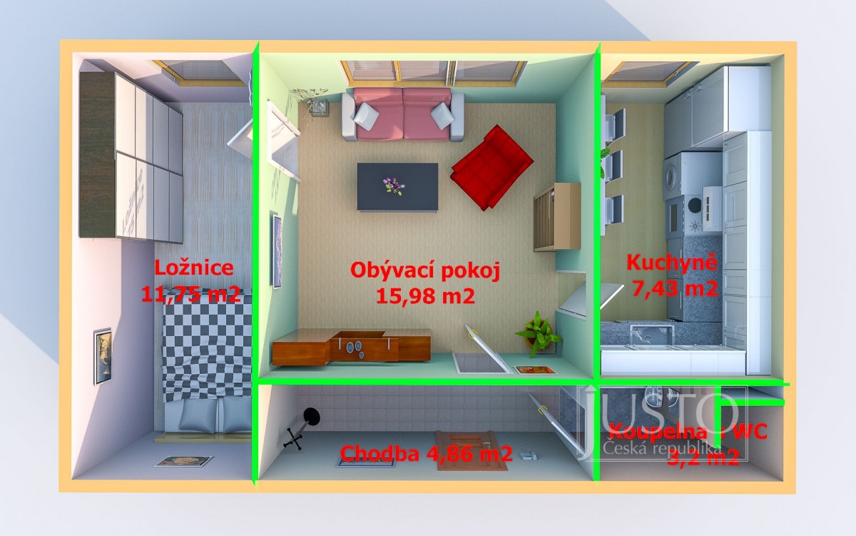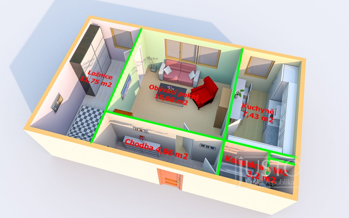 Celková výměra bytu je 51, 4 m² včetně sklepa.