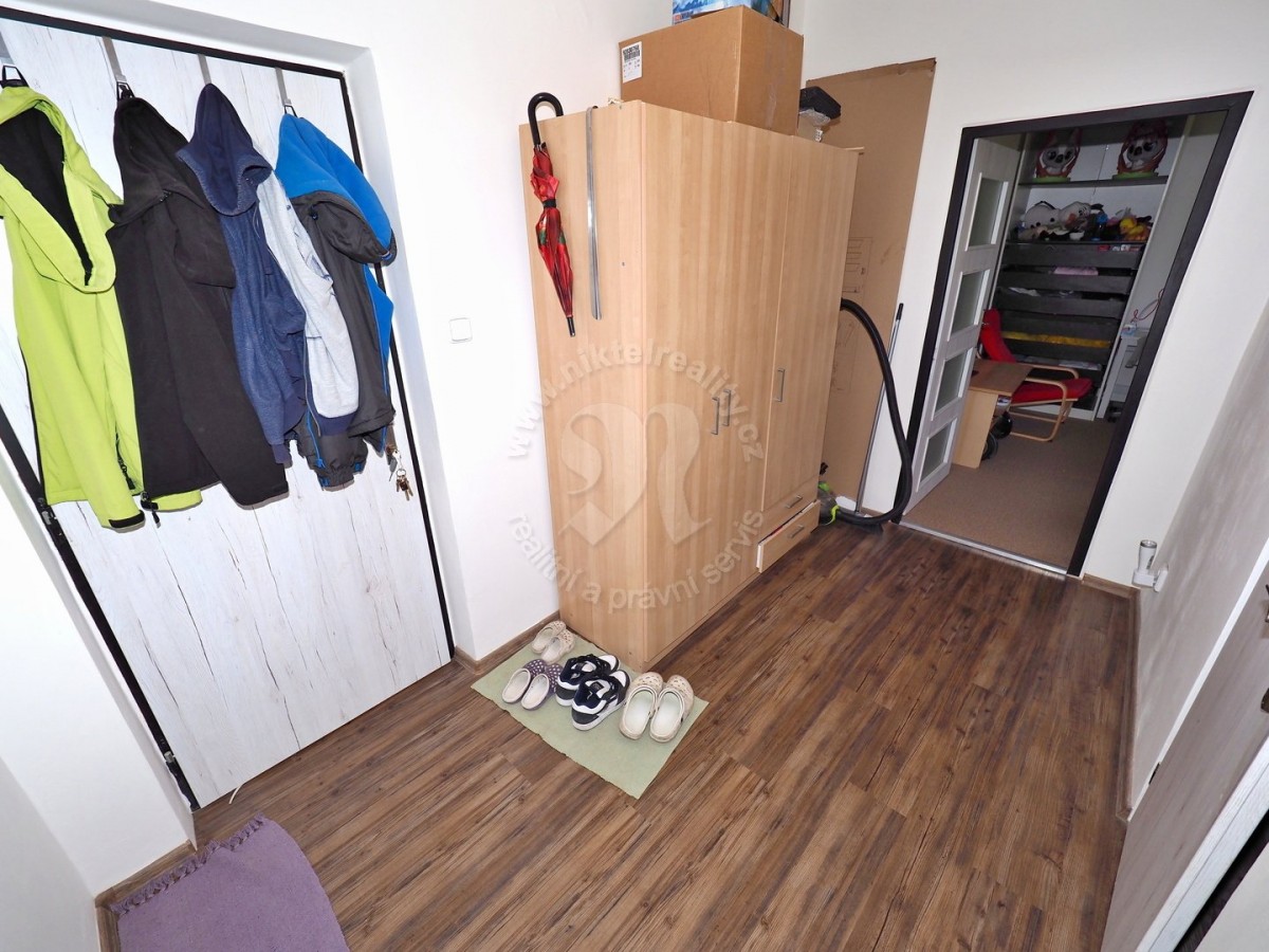 Členění bytu: kuchyně (9 m2) s osazenou kuchyňskou linkou včetně úložných prostorů, nerezový dřez, plynový sporák s troubou a místem na lednici a pračku včetně přípojek pro ně, na zemi položeno PVC v dekoru tmavého dřeva. Na kuchyň navazuje vstupní chodba, ze které se vstupuje do obou samostatných obytných místností a do společné koupelny s toaletou. Všechny obytné místnosti mají nová plastová okna směrovná na jih s výhledem do zeleně a na okolní obytnou bytovou zástavbu. Oba pokoje mají na zemi položen koberec, chodba a koupelna s toaletou mají položeno PVC. Ve vstupní chodbě je dostatek prostoru a jsou zde umístěny šatní skříně.