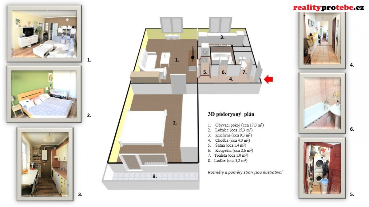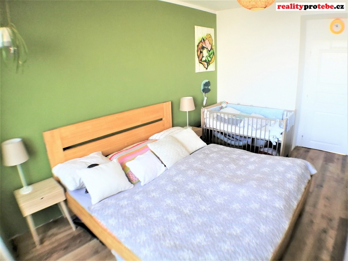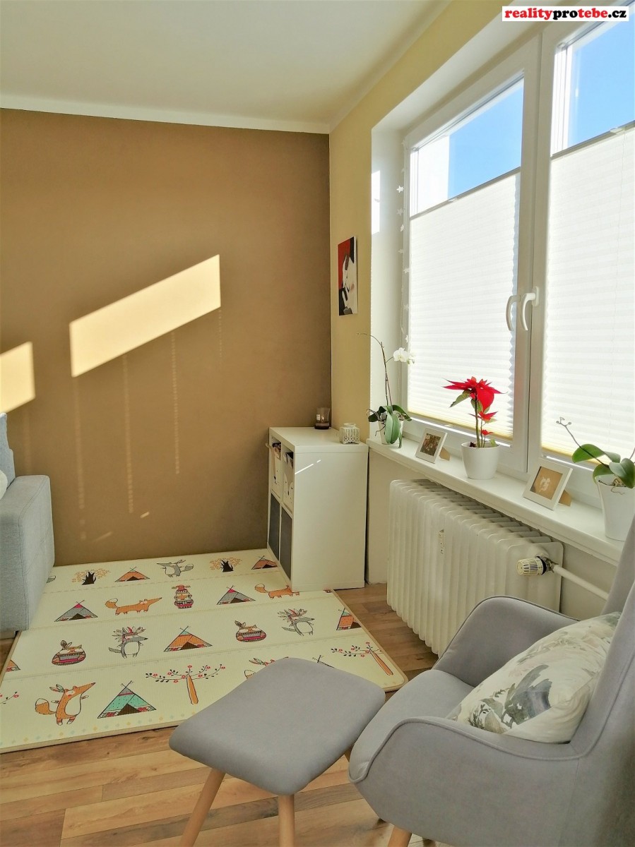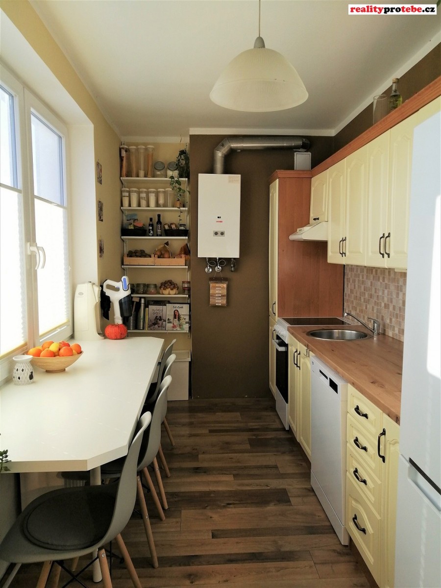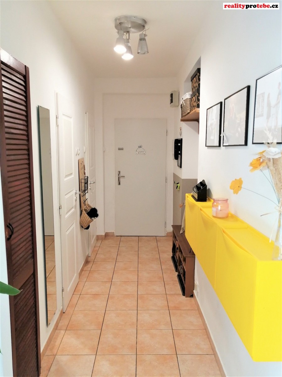Byt. jednotka umístěná ve čtvrtém nadzemním podlaží (3. patro) cihlového bytového domu o dvou samostatných vchodech byla postupně rekonstruována. V rámci rekonstrukčních prací byly v části bytu vyměněny rozvody elektřiny, nově vyštukováno, položena plovoucí podlaha a dlažby, instalovány rolety do všech oken a instalována nová karma na ohřev teplé vody. Kuchyňská linka vybavená mnoha úložnými skříňkami je taktéž zánovní. Zděná koupelna vybavena vanou a umyvadlem sousedí s prostornou komorou, ve které jsou police a dostatečný prostor pro umístění pračky a sušičky. Okna bytu orientována na jih (obývák a kuchyně) a sever (ložnice).