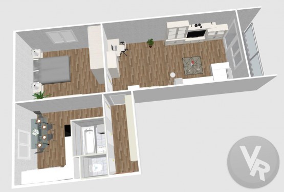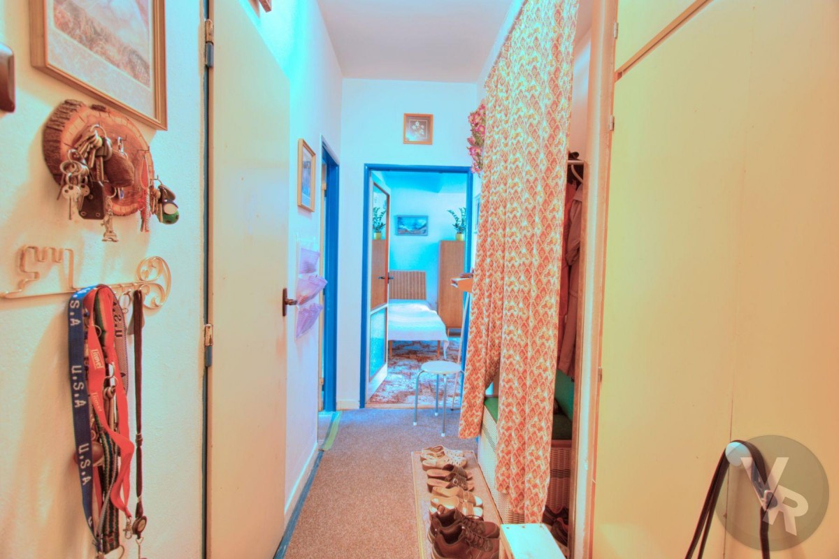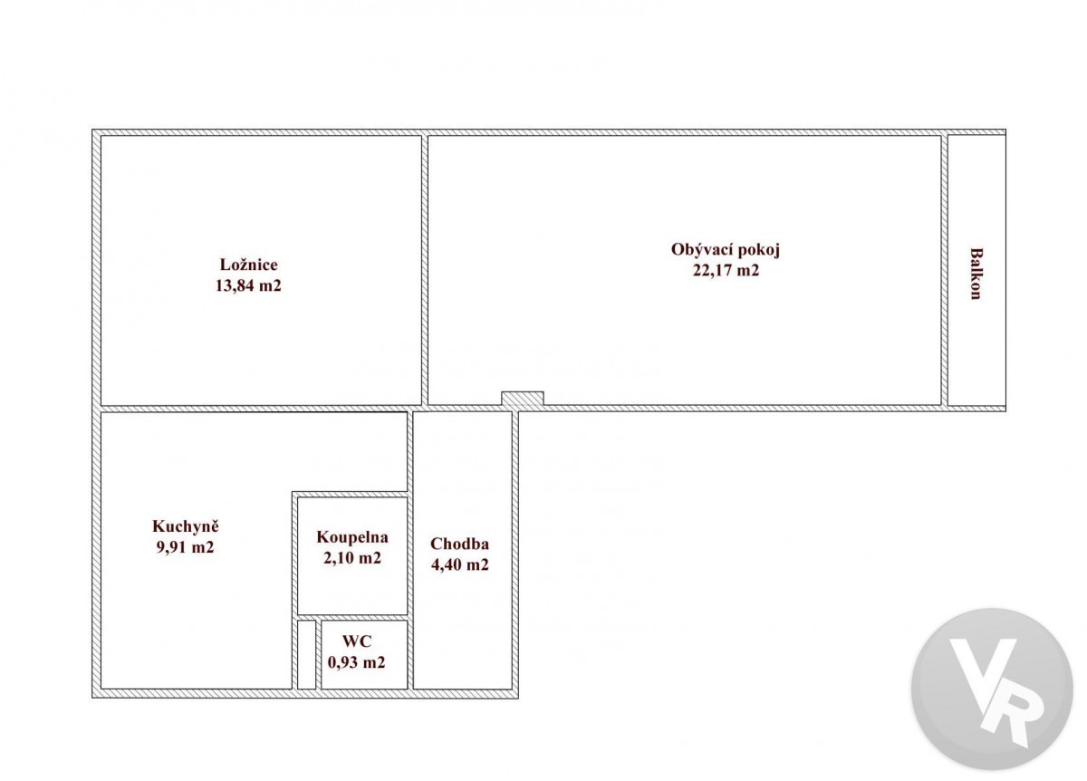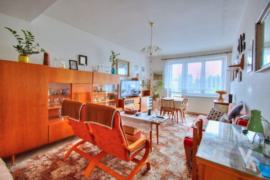 Dispozice: Vstupní chodba 4, 4 m2, koupelna s vanou 2, 10 m2, samostatná toaleta 0, 93 m2. Z Chodby se vchází do kuchyně 9, 91 m2, obývacího pokoje 22, 17 m2 a do ložnice 13, 4 m2. Do ložnice je možný vstup i z kuchyně. Z obývacího pokoje je nový prostorný balkon s moc hezkým výhledem do zeleně. K dispozici je i sklep o velikosti 1, 75 m2 a společná kolárna a kočárkárna. Byt. jednotka je v udržovaném standardu.
