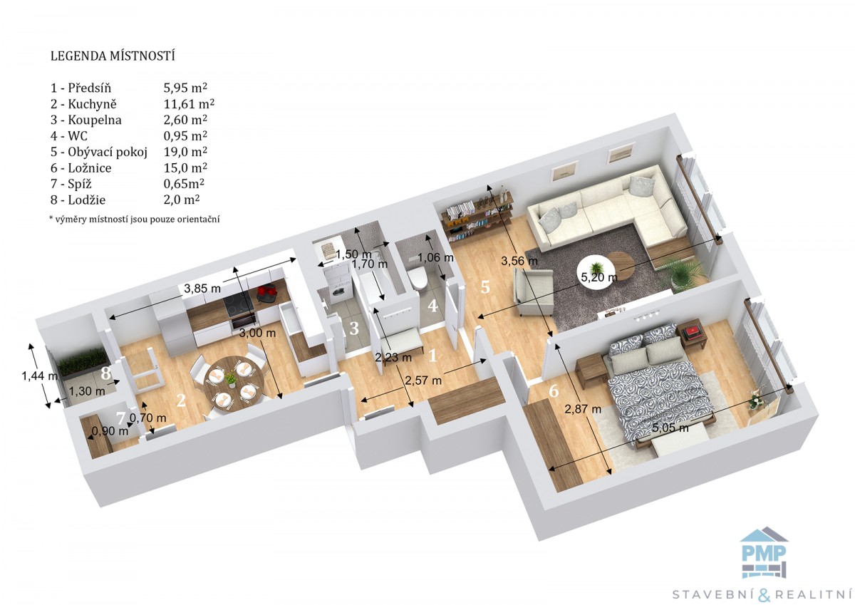 Výměry místností: předsíň - 5, 95 m², kuchyně - 11, 61 m², spíž - 0, 65 m², koupelna - 2, 60 m², sociální zařízení WC - 0, 95 m², obývací pokoj - 19 m², ložnice - 15 m², lodžie - 2 m², sklepní kóje - 4, 7 m².