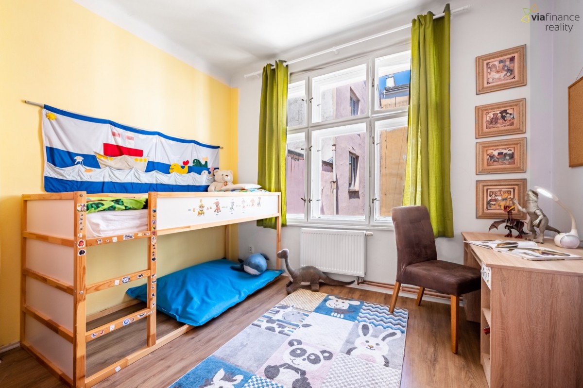 Vstup do bytu je řešen předsíní a příjemnou vstupní halou, která propojuje všechny místnosti v bytě. Z jedné strany jsou vstupy do dětského pokoje a kuchyňského koutu se vstupem na balkón. Z druhé strany poté vstup do obývací místnosti s kvalitně provedenou vestavbou a velkým prostorem pro spaní. Dále je v bytě technická místnost, samostatná koupelna a samostatné sociální zařízení WC. Vestavěné skříně ve vstupní hale otevírají vstupní prostor a dávají nemovitosti pocit využití v podobě 3kk. Nemovitost a tuto bytovou jednotku je nutné vidět. Zaujme nejen svou polohou, ale také dispozičním uspořádáním jednotlivých místností. Nemovitost je svou polohou vhodná jako investice k pronájmu i pro vlastní bydlení. Metro i tramvaj v minutové vzdálenosti. Fond oprav jen 2. 320, - Kč, anuita splacena.