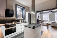 Kompletní vybavení zahrnuje: dřevěné podlahy a dlažba, podlahové vytápění v koupelně, bezpečnostní dveře, kompletně vybavená kuchyňská linka všemi spotřebiči, myčka, pračka, sušička, TV, domácí vrátný.