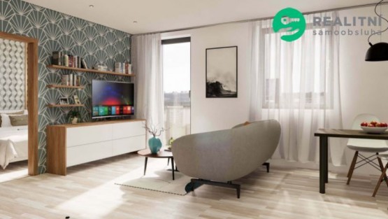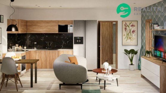 Ve vstupní chodbě bytu, je praktický prostor pro vestavěnou skříň nebo samostatnou šatní skříň či botník. Dále pak ze vstupní chodby můžete vstoupit do ložnice, obývacího pokoje a do koupelny. Koupelna je již zařízena vanou s vanovou baterií a sprchovým setem, sociální zařízení WC, a již ve standardu do koupelny dodáváme kompletní set umyvadlové skříňky s umyvadlem, vodovodní baterií, zrcadlem a osvětlením. Ve fázi výstavby si můžete vybrat a změnit typ obkladu a dlažby dle svého vkusu. V koupelně je pro větší tepelný komfort navrženo podlahové vytápění. Kuchyňský kout je řešen moderně s obývacím pokojem, jehož nedílnou součástí je i balkon. Vedle obývacího pokoje je pěkná samostatná ložnice.