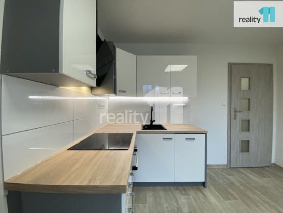 Dispozice bytu: vstupní chodba oddělena příčkou a dveřmi, kuchyň s obývacím pokojem, ložnice, zděná koupelna se sprchovým koutem, závěsná skřínka s umyvadlem, závěsné sociální zařízení WC. Nová moderní kuchyňská linka do L, vybavena komplet spotřebiči - vestavná trouba, komínový odsavač par, sklokeramická deska a myčka na nádobí. Příjemné prostředí v bytě vytvářejí snížené stropy s bodovými světly v kuchyni, koupelně a na chodbě. Podlahy vylité nivelační stěrkou a položeno nové kvalitní PVC ve stejném dekoru, moderní interiérové dveře a zárubně.
