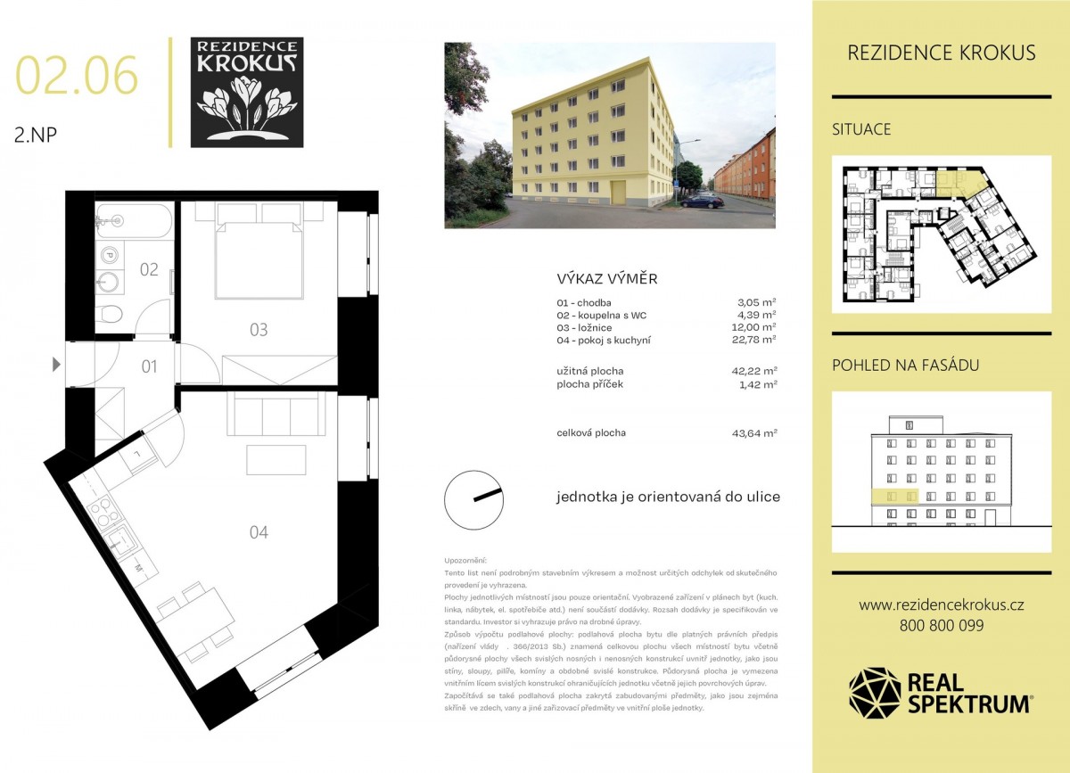 Dispozice bytu: vstupní chodba (3, 05 m²), obývací pokoj s kuchyňským koutem (22, 78 m²), ložnice (12, 00 m²), koupelna s sociální zařízení WC (4, 39 m²)