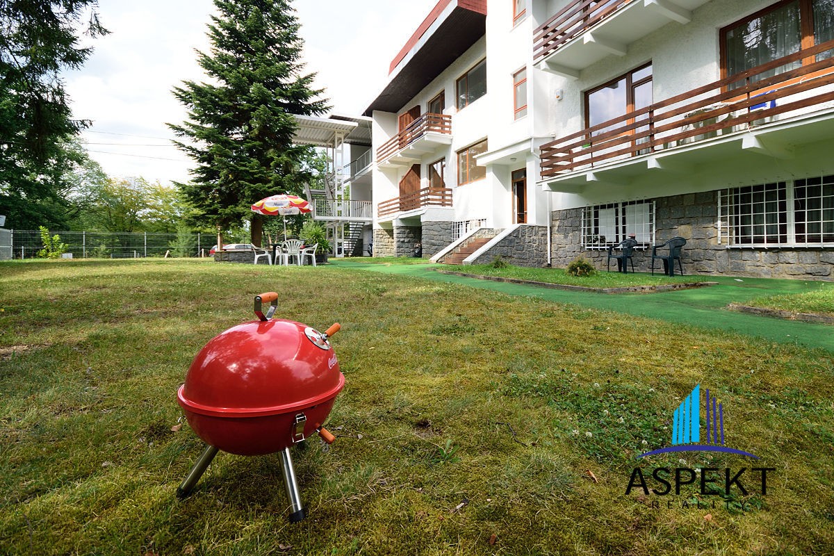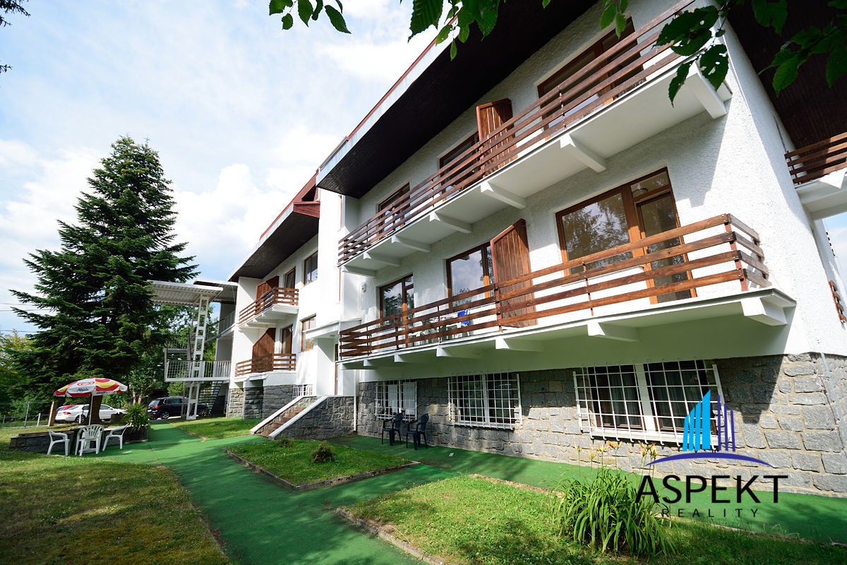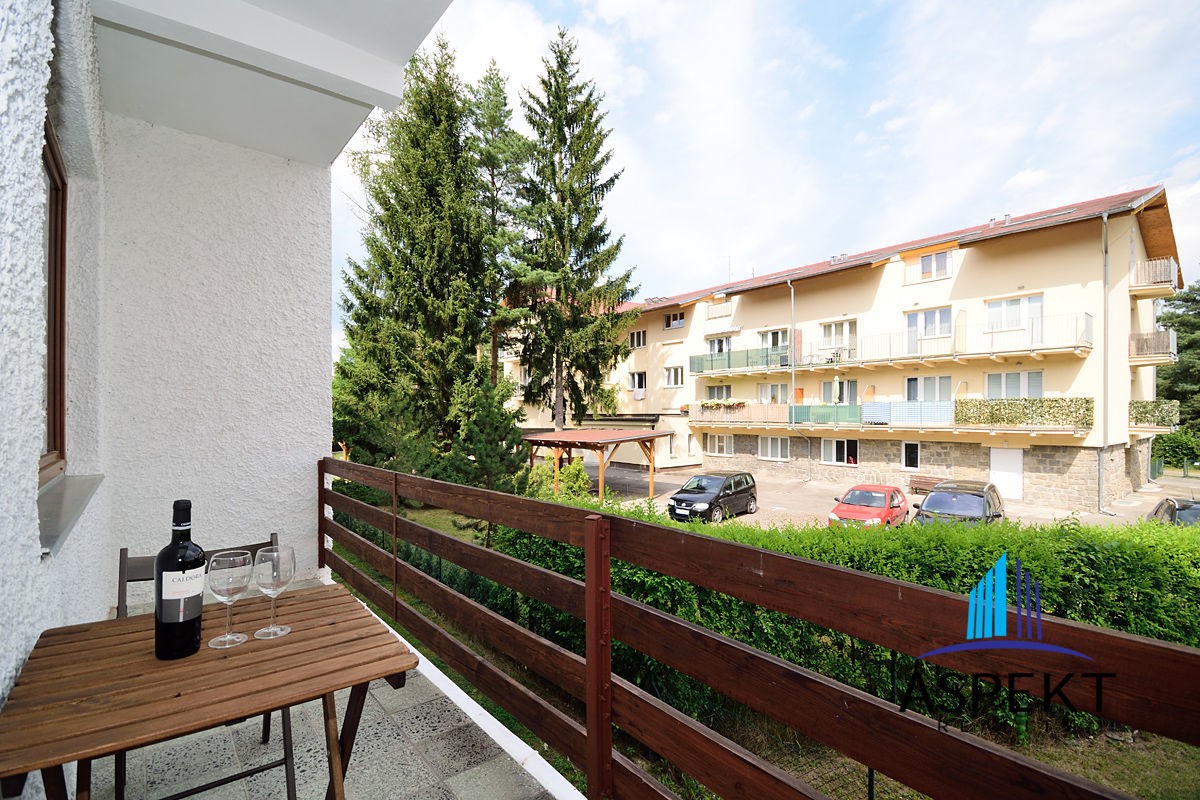 Apartmán o podlahové ploše 35, 7 m2 se skládá z obývacího pokoje s TV a DVD,  rozkládací pohovkou s úložným prostorem,  rozkládacím jídelním stolem se židlemi a z kuchyňského koutu s novou a vybavenou kuchyní (indukční varná deska,  trouba,  vestavěná lednice s mrazákem,  mikrovlnná trouba,  myčka,  digestoř).  V ložnici,  oddělené částečně příčkou,  se nachází dvoulůžko s úložným prostorem a masivní vestavěná skříň.  Koupelna se sprchovým koutem,  umyvadlem,  sociální zařízení WC.   K jednotce přísluší též velká (8, 8 m2) lodžie se vstupem z obývacího pokoje.  Nové bezpečnostní vchodové dveře a předsíňová stěna.