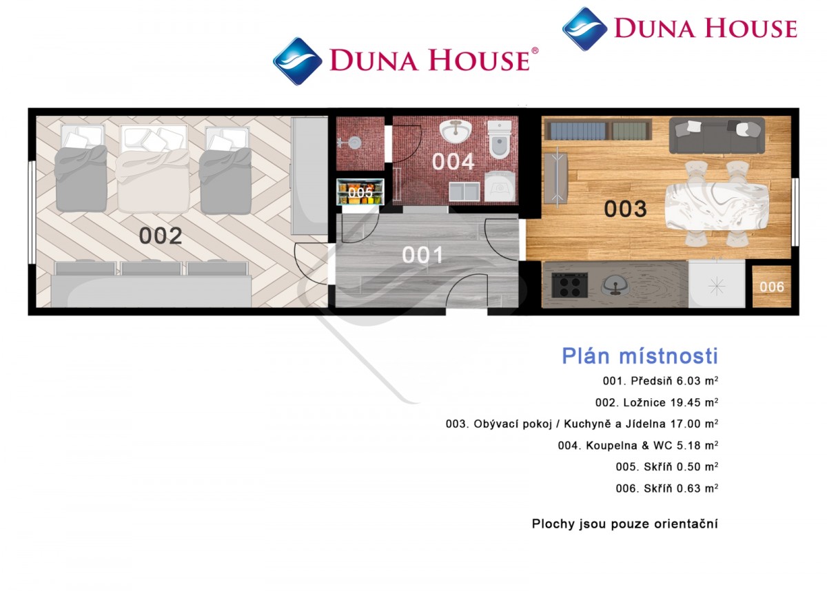Dispozice je 2+kk a sestává z prostorné vstupní předsíně, obývacího pokoje s kuchyňským koutem, ložnice, koupelny s toaletou a dvou komor. Výhodou je dostatek úložného prostoru (spíž v kuchyni, technická místnost v předsíni a velké vestavěné skříně).