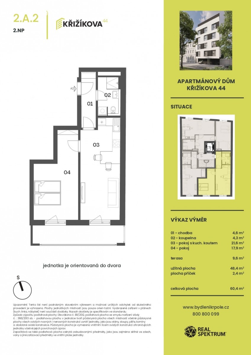 chodba (4, 6 m²), obývací pokoj s kuchyňským koutem (21, 6 m²), pokoj (17, 9 m²), koupelna s sociální zařízení WC (4, 3 m²), terasa (9, 6 m²), sklep