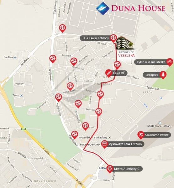 Přímo 50 m od Rezidence Veselská se nachází autobusová zastávka, ze které se obyvatelé dostanou autobusem za 5 min. k metru Letňany, trasa C. Rychlé spojení na metro a následně do centra Prahy. Rychlé spojení autem s centrem Prahy a napojení na Pražský okruh.