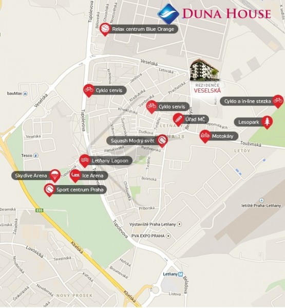 V blízkosti také naleznete nově vybudovaný Lesopark, který je kombinací lesa, zeleně, pěšin pro procházky s dětmi nebo cyklostezky. Aquacentrum Letňany Lagoon, Centrum aktivního životního stylu Blue Orange, Skydive Arena, více než 500 m dlouhá motokárová dráha, Squash Modrý svět, Multikino a mnoho dalšího.