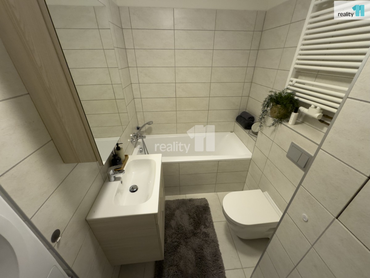 Byt je dispozičně členěn na obývací pokoj s kuchyní, ložnici s balkónkem, předsíní, koupelnou s sociální zařízení WC dohromady (s vanou a umyvadlem) a šikovným koutem na pračku a sušičku.