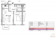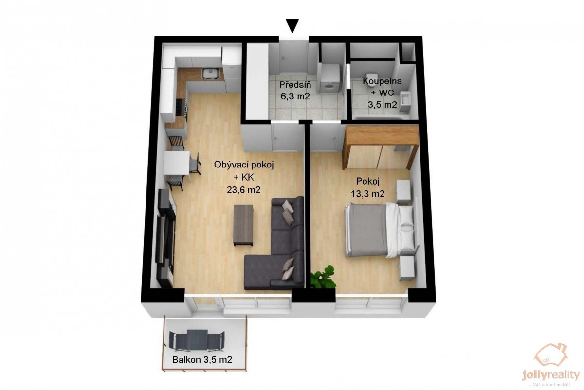 Do bytu se vchází předsíňkou 6, 30 m2, ze které je vstup do ložnice 13, 34 m2 a do koupelny spojené s sociální zařízení WC 3, 48 m2. Dále je zde vstup do obývacího pokoje 23, 56 m2 s kuchyňským koutem.