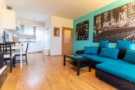 Prostor určený pro kuchyň je vybavený pěknou moderní bílou kuchyňskou linkou s elektrospotřebiči (zabudovaná myčka na nádobí, elektrická mikrovlnná trouba, el. pečicí trouba, el. indukční deska a digestoř).