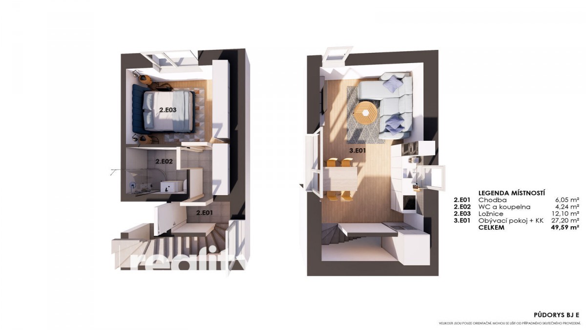 Atypické rozložení: V 1. patře najdete prostornou ložnici a moderní koupelnu, ve 2. patře pak světlý obývací pokoj s kuchyní, ideální pro pohodlné bydlení.