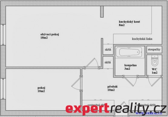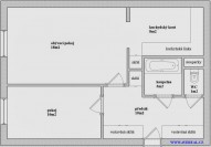Dispozice: obývací pokoj s kuchyňským koutem (cca 26 m2), ložnice (10 m2), předsíň (10 m2), koupelna (3 m2) a samostatné sociální zařízení WC (1 m2).