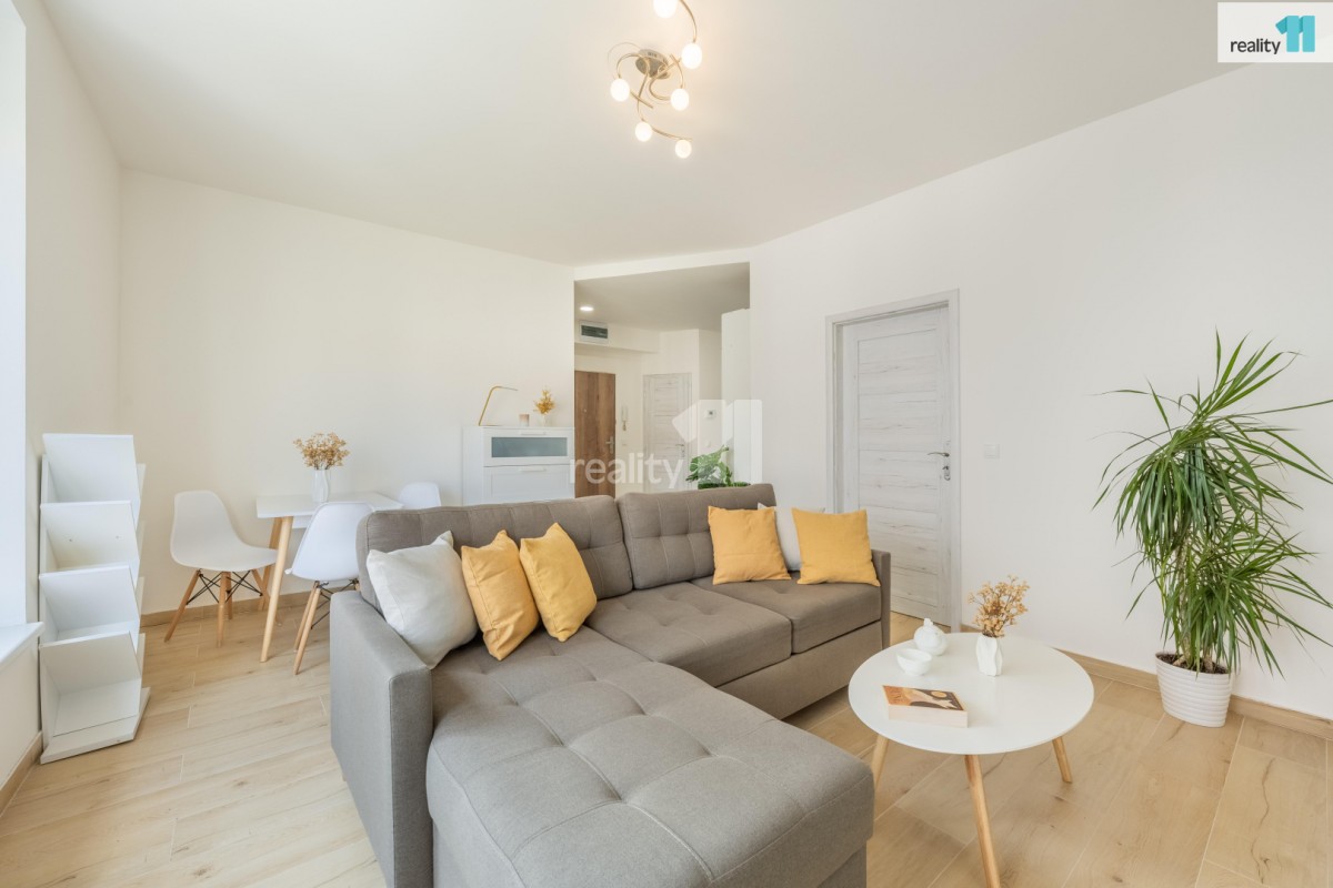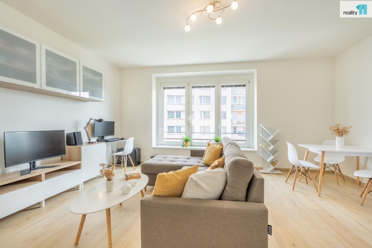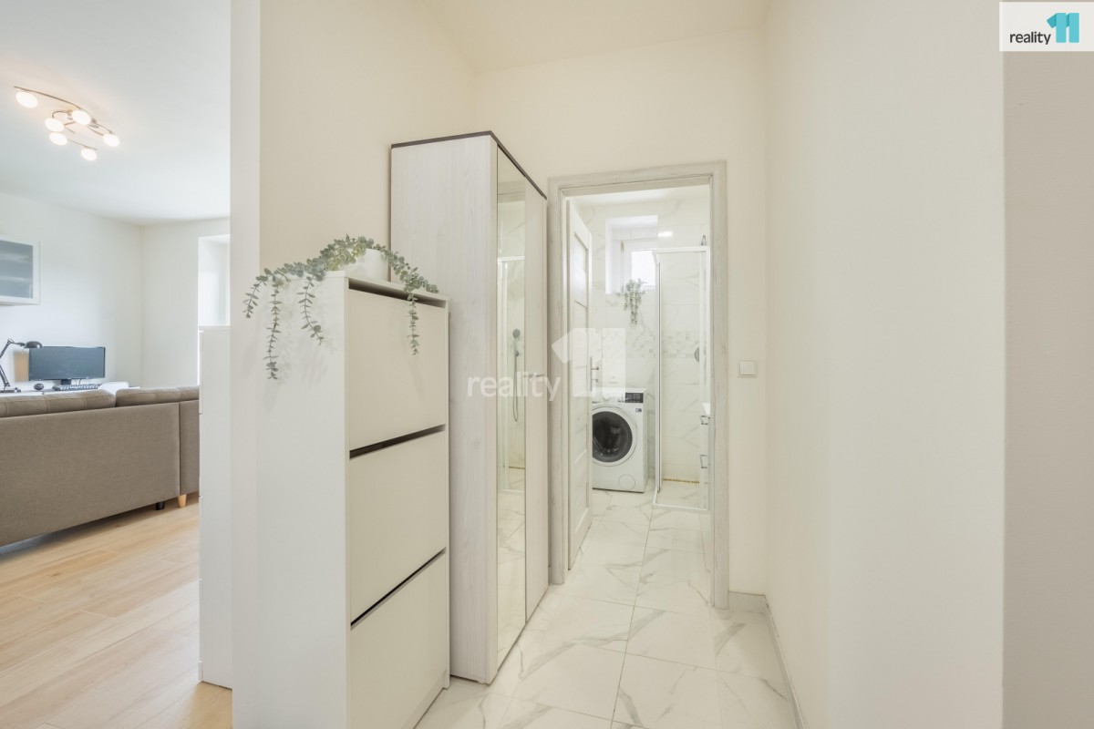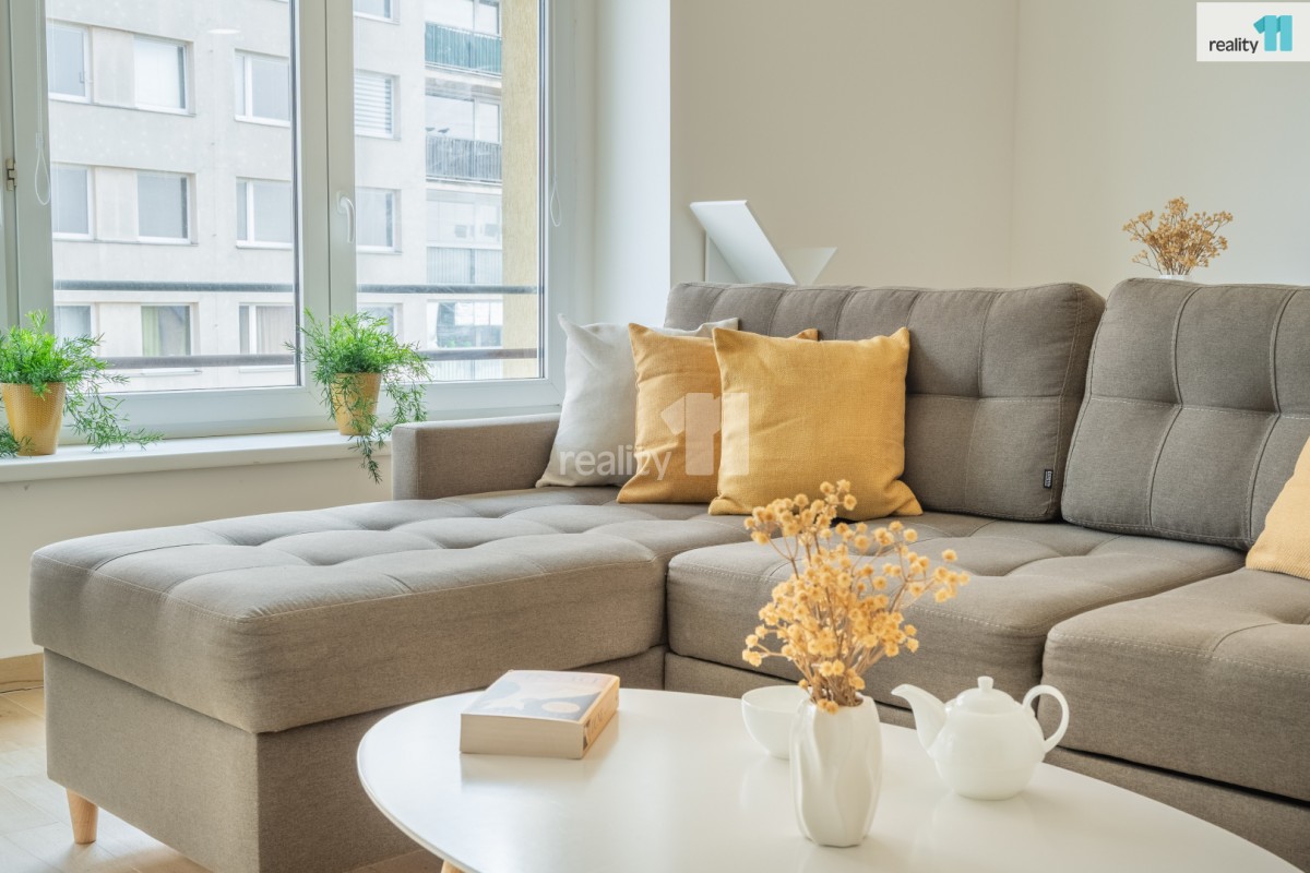 Byt dostal novou dispozici: novou předsíň s kuchyňským koutem s novou kuchyňskou linkou s vestavěnou lednicí, myčkou a plynovým sporákem, obývací pokoj, ložnici, koupelnu a samostatné sociální zařízení WC. Vznikl tak vzdušný, otevřený prostor, interiér působí svěže a nadčasově. Světlé tóny a promyšlené řešení vytváří příjemnou atmosféru. Kuchyňská linka v bílém provedení působí elegantně a snadno ji sladíte s vlastním stylem.