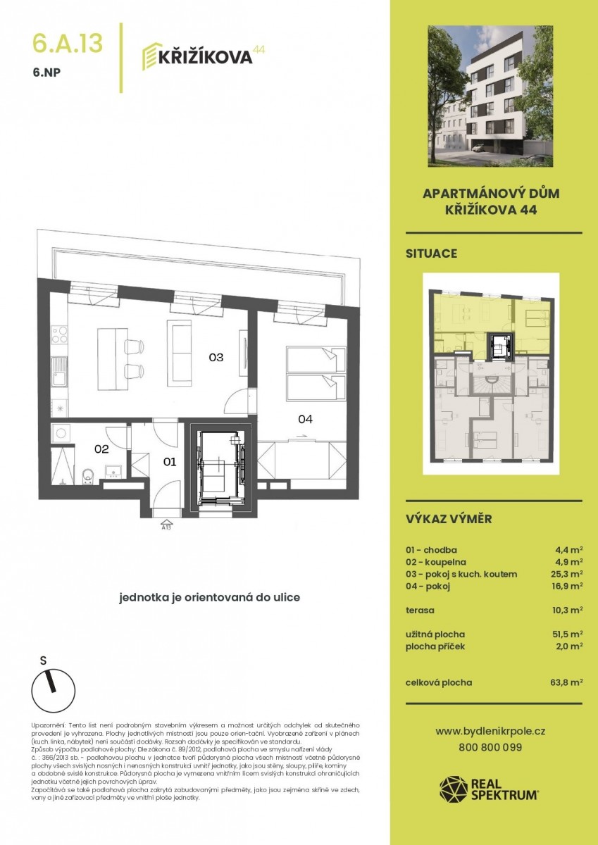 chodba (4, 4 m²), obývací pokoj s kuchyňským koutem (25, 3 m²), pokoj (16, 9 m²), koupelna s sociální zařízení WC (4, 9 m²), terasa (10, 3 m²), sklep