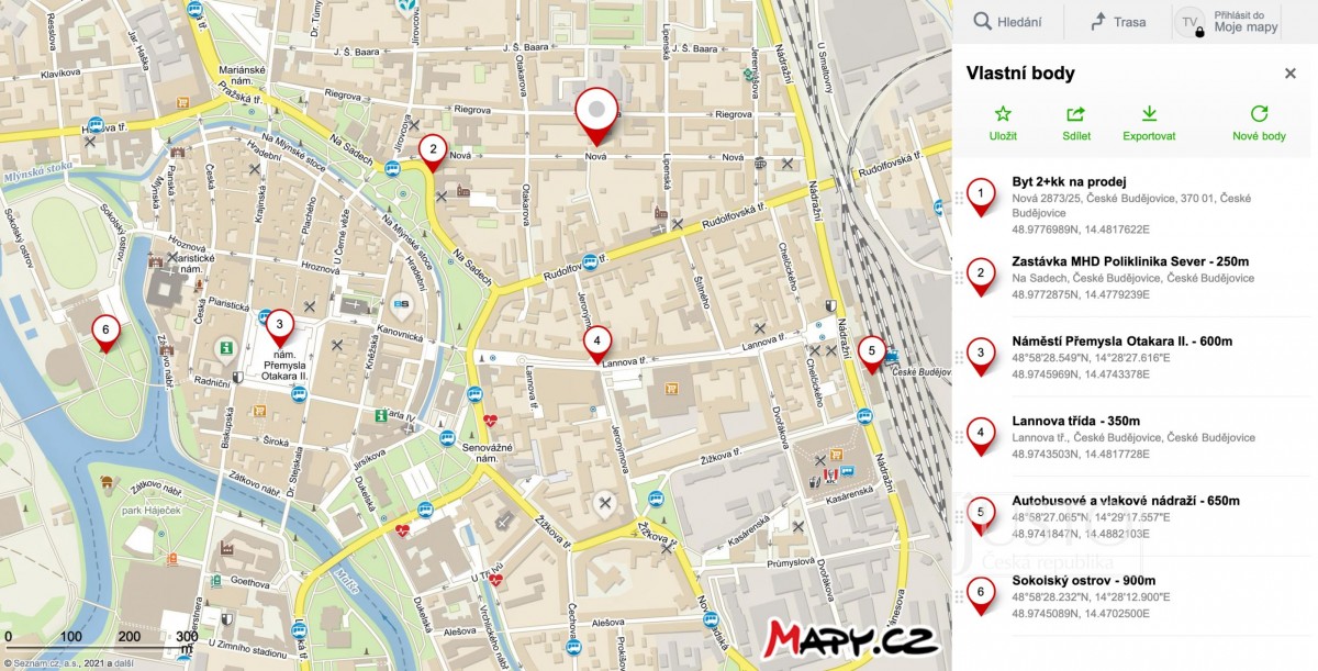 Z bytu se po 250m dostanete k zastávce MHD Na Sadech (Poliklinika Sever) a po cca 600m přímo na Náměstí Přemysla Otakara II. V docházkové vzdálenosti tak máte kompletní občanskou vybavenost – školy, lékaře, úřady, poštu, ale i zábavu (centrum města) a přírodu (Sokolský ostrov).