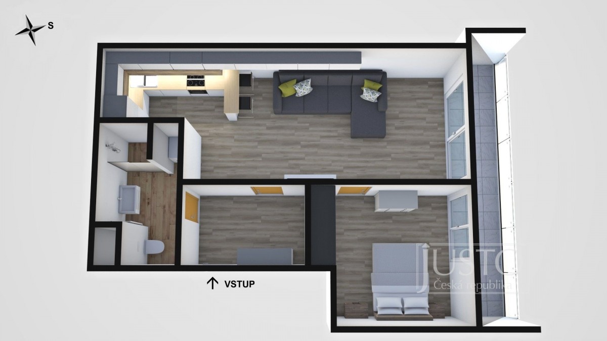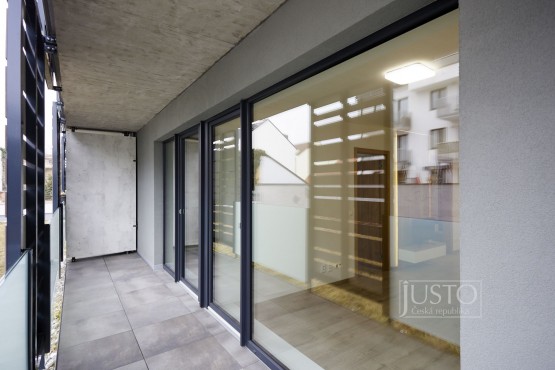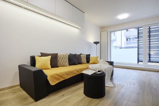 Díky velkým oknům na balkón, který je orientovaný do klidného vnitrobloku (sever), je byt světlý – v létě je v bytě i na balkónu velice příjemná teplota. Dle prohlášení vlastníka je byt dispozičně 1+kk. Majitel v obývacím pokoji sádrokartonovou příčkou vytvořil smysluplnější dispozici 2+kk – oba pokoje mají svůj vlastní vstup na balkón. Podobně jednoduše můžete toaletu oddělit od koupelny – vzduchotechnika i elektro rozvody jsou na to připravené.
