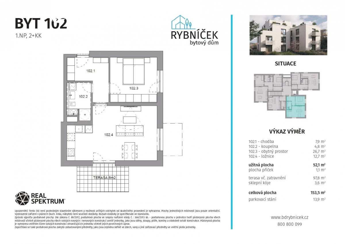 Dispozice: chodba (7, 9 m²), pokoj s kuchyňským koutem (26, 7 m²), pokoj (12, 7 m²), koupelna s sociální zařízení WC (4, 8 m²), terasa včetně zatravnění (89, 8 m²), sklepní kóje (3, 6 m²), parkovací stání (13, 9 m²)