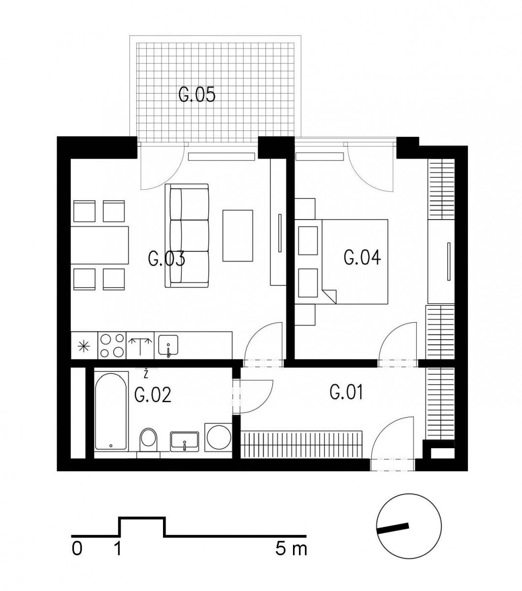 Byt se skládá ze vstupní chodby (8, 9 m²), obývacího pokoje s kuchyňským koutem (20, 6 m²), ložnice (15, 4 m²) a koupelny s toaletou (5, 4 m²). K bytu náleží také balkon (7, 0 m²) s výhledem do klidného okolí a sklepní kóje o výměře 3, 5 m².