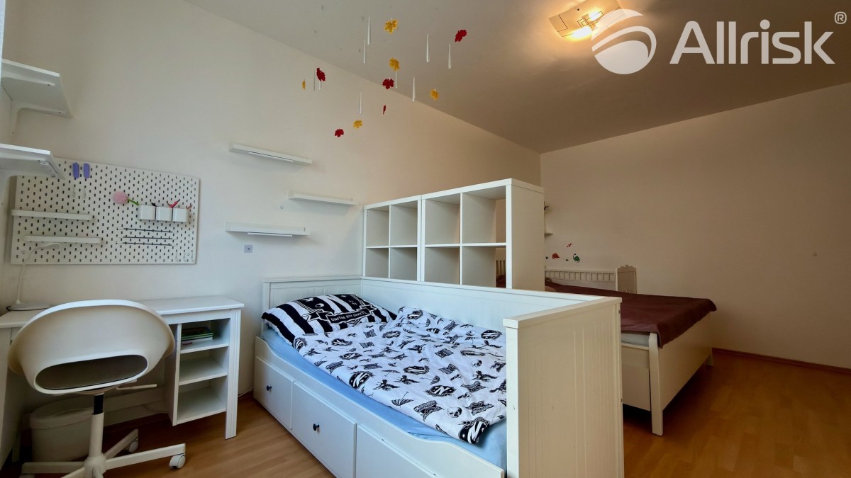 Z obývací části se vstupuje do velké,  podlouhlé ložnice,  která nabízí dostatek prostoru pro vytvoření dětského pokoje nebo pracovního koutku.  Díky své velikosti lze ložnici snadno rozdělit,  což z bytu dělá flexibilní a funkční prostor i pro rodiny s dětmi.
