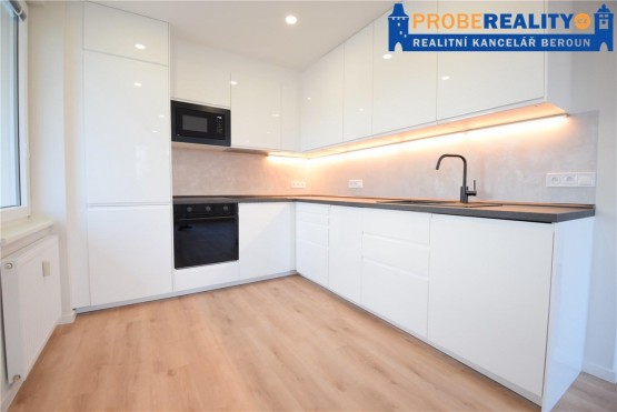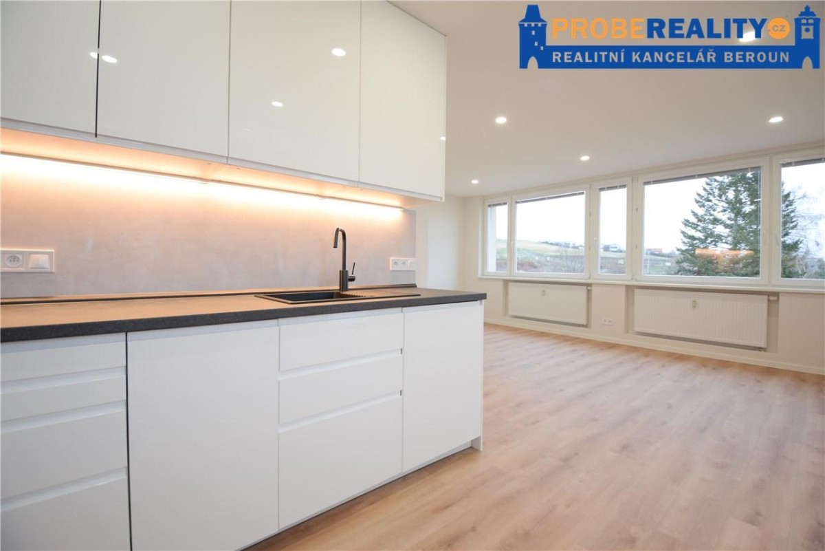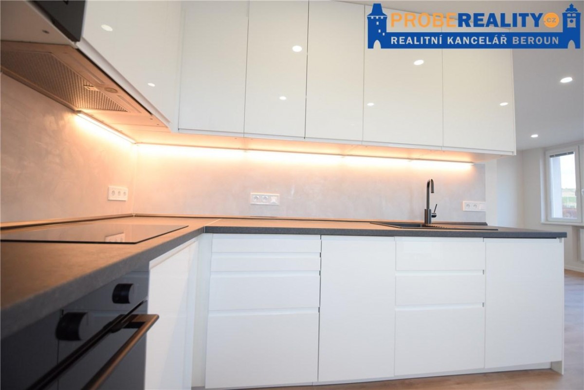 Nabízíme k prodeji dispozičně dobře řešený a slunný byt, 2+kk, 57 m2 / L, který se nachází v 4p/4p, revitalizovaného panelového domu ul. pod Homolkou Beroun. Cel...ý byt prošel kompletní a zdařilou rekonstrukcí. Důraz byl kladen na vysoký standart všech prací a zařizovacích předmětů. Byt tak působí světlým a prostorným dojmem. Ve všech místnostech nalezneme snížené stropy s integrovanými svítidly. Kuchyňská linka je na míru s veškerými vestavěnými spotřebiči (lednice, mrazák, sporák, myčka, pračka mikrovlnná trouba, - vše je nové a ještě v záruce). Z kuchyně je také volný vstup na prostornou lodžii, která je orientovaná do klidného vnitrobloku a na které nalezneme klimatizační jednotku určenou pro tento byt. Koupelna je vybavena sprchovým koutem. Jako podlahová krytina bylo použito kvalitní PVC a dlažba. Okna bytu jsou orientována na V/J, což zaručuje vysokou slunnost bytu. Velice klidná a žádaná lokalita s dostatkem soukromí a zeleně. Kompletní občanská vybavenost v místě. Výborná dostupnost na dálnici D5 směr Praha.