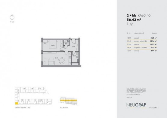 Velkorysý byt 2+kk o ploše 56 m2 nacházející se v 1. patře novostavby Neugraf včetně výtahu. Byt je součástí originálního projektu NEUGRAF, který navazuje na původn...í historickou budovu tiskárny v ulici Grafická. Exteriér kombinuje materiály průmyslové doby doplněné lehkými detaily z oceli a skla. To vše doplněno zelení vnitřního zahradního nádvoří. Poloha projektu, vysoko nad hlukem centra Smíchova, přináší budoucím nájemníkům panoramatický výhled na Prahu. Terasovitá střecha plná zeleně je prostorem pro posezení s přáteli, kde každý den zapadá slunce nad Prahou, a kde najdete vnitřní klid v rušném městě.