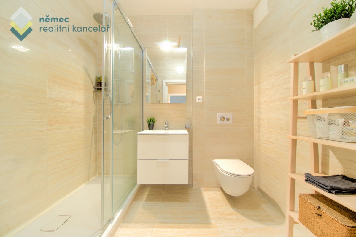 Z předsíně lze vstoupit do praktické komory s pračkou a úložným prostorem, anebo do prostorné koupelny s walk - in sprchovým koutem a závěsným sociální zařízení WC.