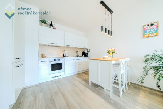 Dominantou prostorného obývacího pokoje je moderní bílá rohová kuchyňská linka na míru s ostrůvkem včetně vestavných spotřebičů (indukční varná deska a horkovzdušná trouba Bosh, digestoř, myčka Electrolux, kombinovaná lednice s mrazákem AEG).