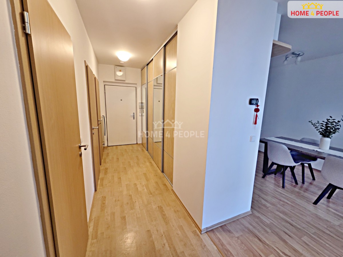 Dispozice bytu zahrnuje světlý obývací pokoj s kuchyňským koutem, samostatnou ložnici, prostornou koupelnu a předsíň s vestavěnou skříní. Kuchyňská linka je vybavena vestavěnými spotřebiči – elektrická varná deska, trouba, lednice s mrazákem a myčka na nádobí.