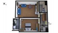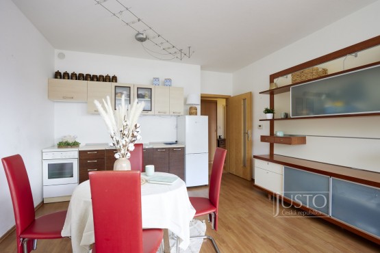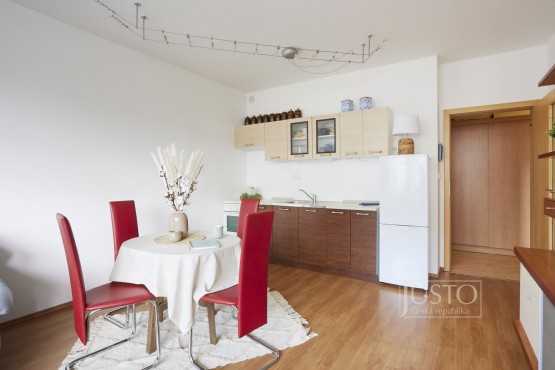 Přes vstupní předsíň se dostanete do praktické komory, samostatné ložnice a do obývacího pokoje. Ten je propojený s kuchyní a můžete z něj vstoupit přímo na terasu orientovanou do klidného vnitrobloku (orientace na jih).