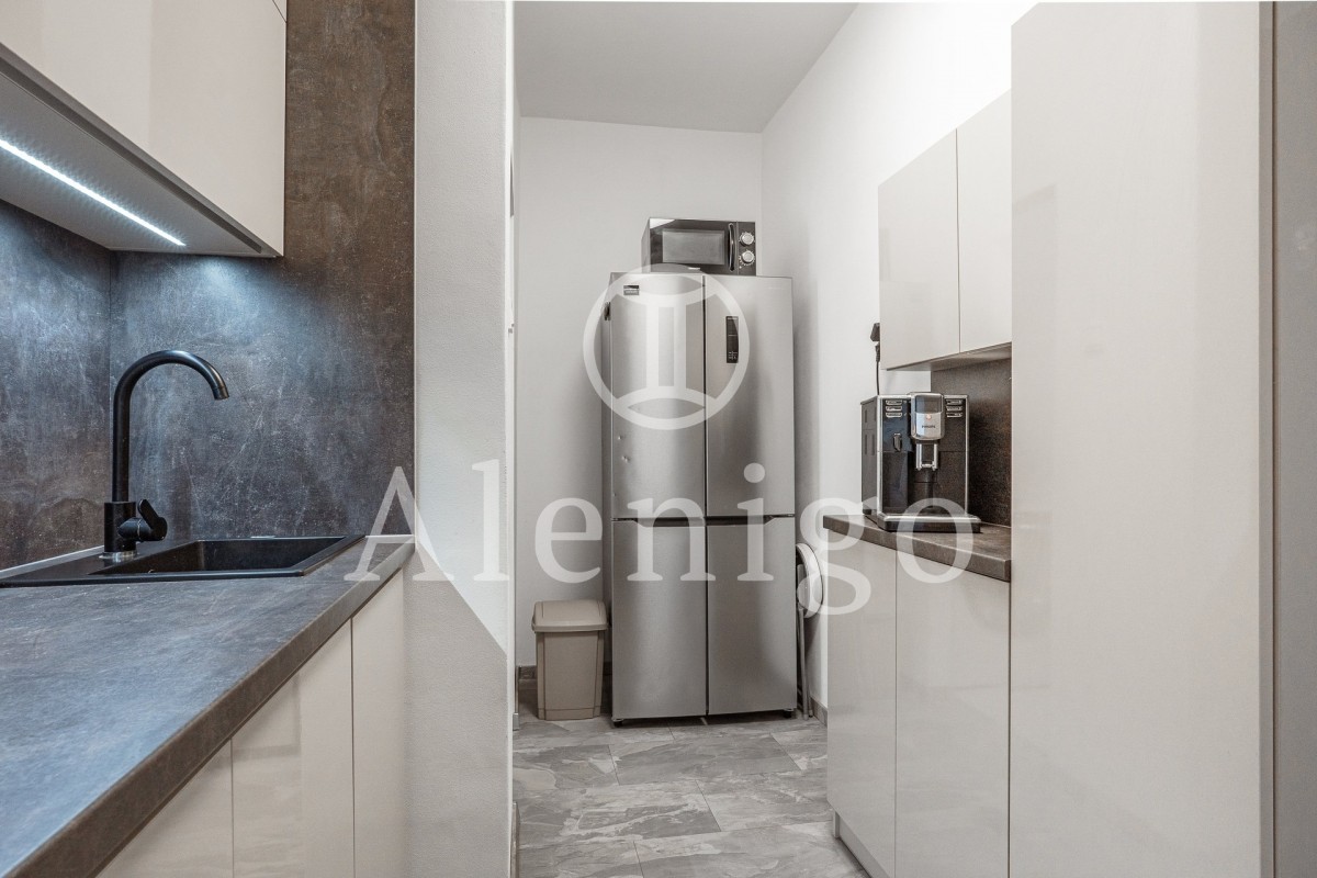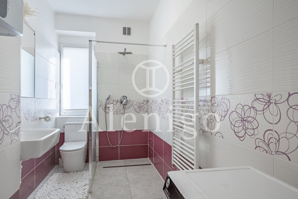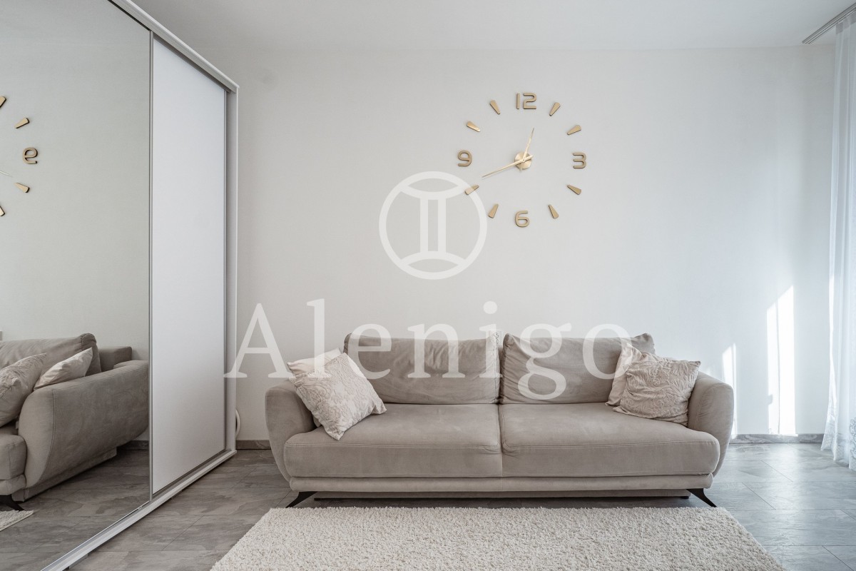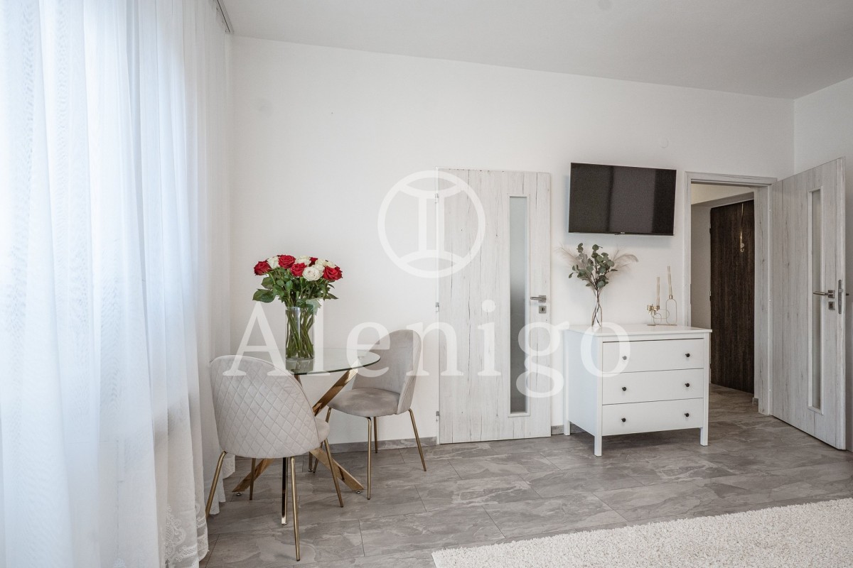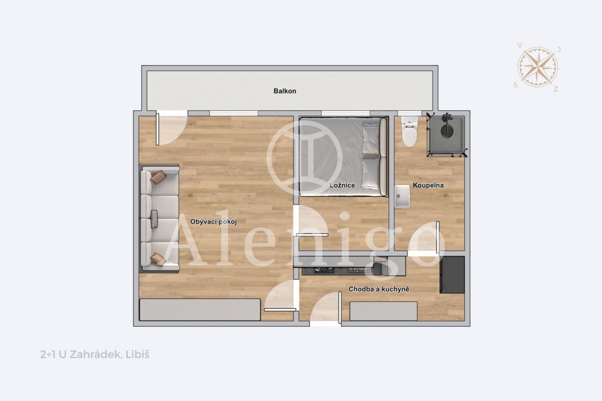 Dispozice: vstupní chodba s kuchyňskou linkou, obývací pokoj s přímým vstupem na balkon, koupelna se sprchovým koutem a sociální zařízení WC. K bytu náleží sklepní kóje.