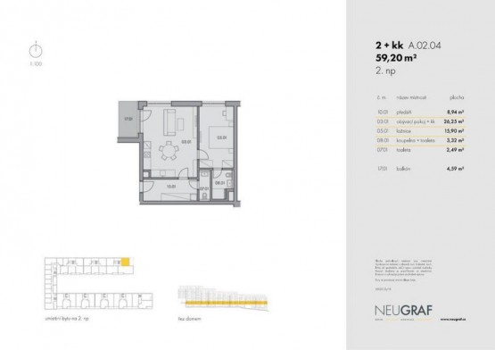 Dobře dispozičně řešený byt 2+kk o ploše 59 m2, s terasou 4. 6 m2 nacházející se v 2. patře novostavby Neugraf včetně výtahu. Byt je součástí originálníh...o projektu NEUGRAF, který navazuje na původní historickou budovu tiskárny v ulici Grafická. Exteriér kombinuje materiály průmyslové doby doplněné lehkými detaily z oceli a skla. To vše doplněno zelení vnitřního zahradního nádvoří. Poloha projektu, vysoko nad hlukem centra Smíchova, přináší budoucím nájemníkům panoramatický výhled na Prahu. Terasovitá střecha plná zeleně je prostorem pro posezení s přáteli, kde každý den zapadá slunce nad Prahou, a kde najdete vnitřní klid v rušném městě.