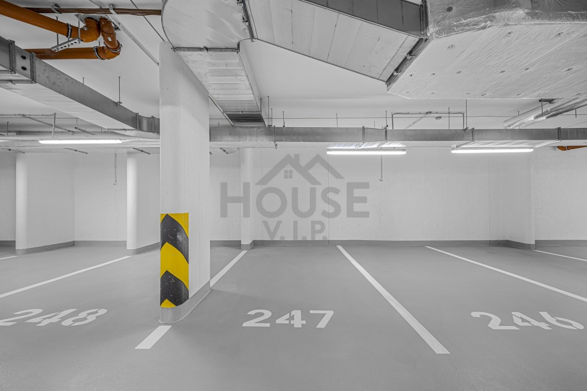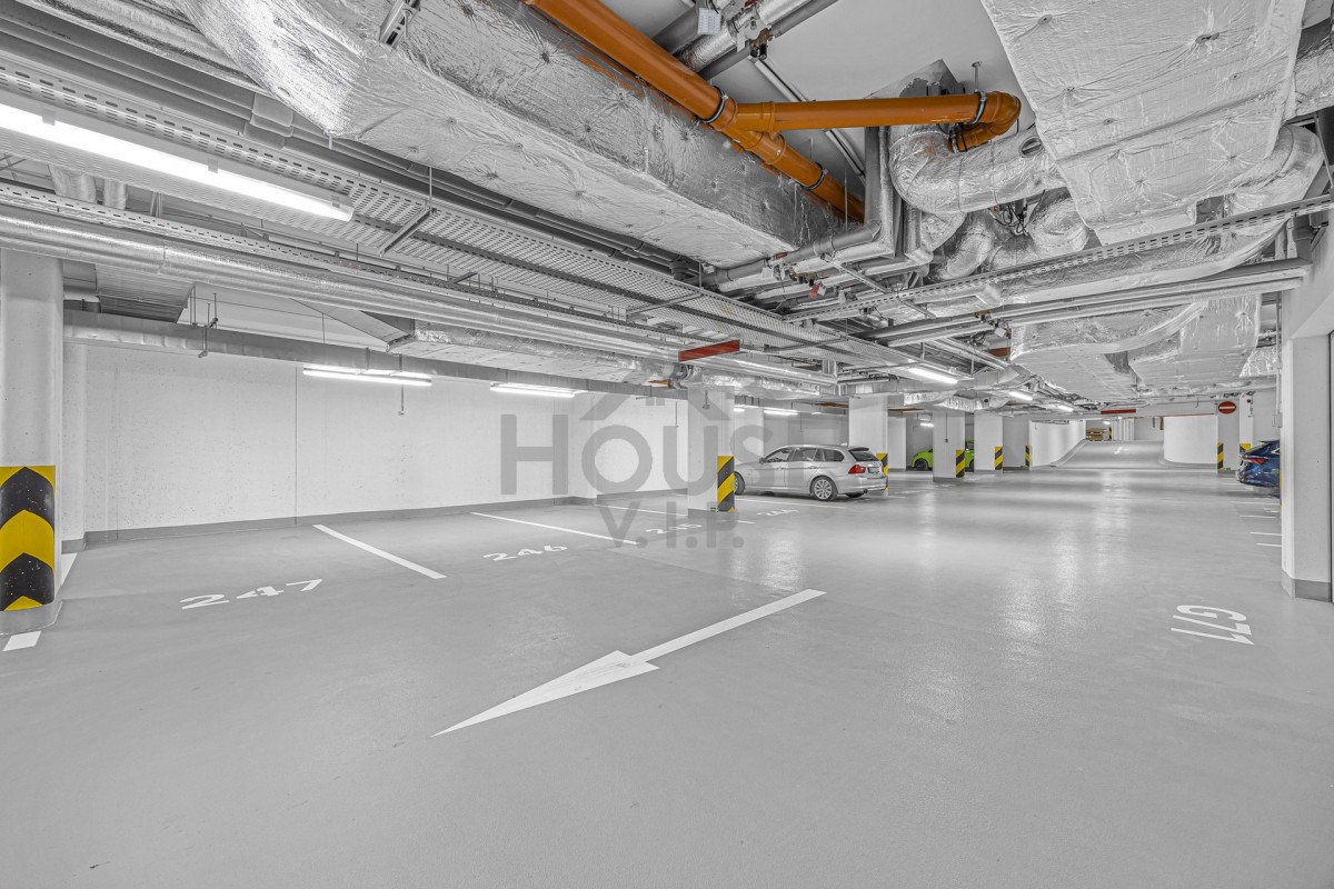 Součástí prodeje je zděná sklepní kóje (3, 6 m²), prostorné garážové stání a možnost využití společného stání pro hosty. V domě je výtah, kočárkárna u vstupu, a objekt je zcela bezbariérový.