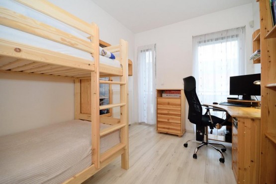 Na podlaze je dlažba a plovoucí podlahy. Ústřední topení. V koupelně podlahové vytápění.