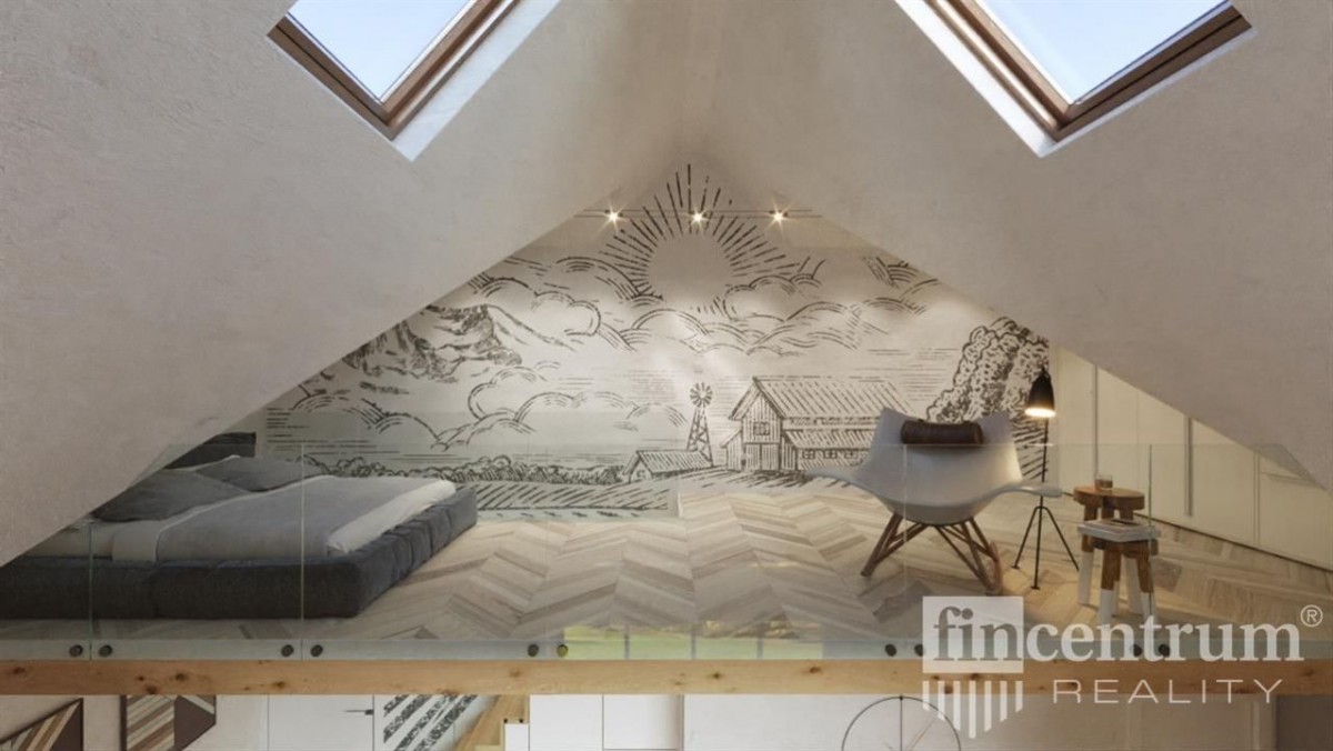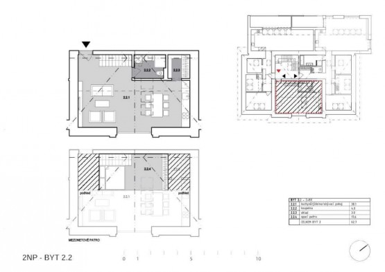 Tento byt je o dispozici 2+kk mezonet s celkovou užitnou plochou 63m. Ve spodní části bytu se nachází vstup do bytu, kterým se dostanete do společenské místnosti s kuchyňským koutem a obývacím pokojem, ve kterém je nádhernou dominantou obrovské okno, díky kterému bude v bytě dostatek světla, které bude dělat byt příjemně prosluněným. Z této místnosti můžete vstoupit do koupelny s toaletou. Hned vedle kuchyňského koutu se nachází velice prakticky místnost, která se dá využít například jako sklad potravin nebo šatna. Po schodech se pak dostanete do druhého patra tohoto bytu, kde se nachází místnost, která může být využívána jako ložnice.