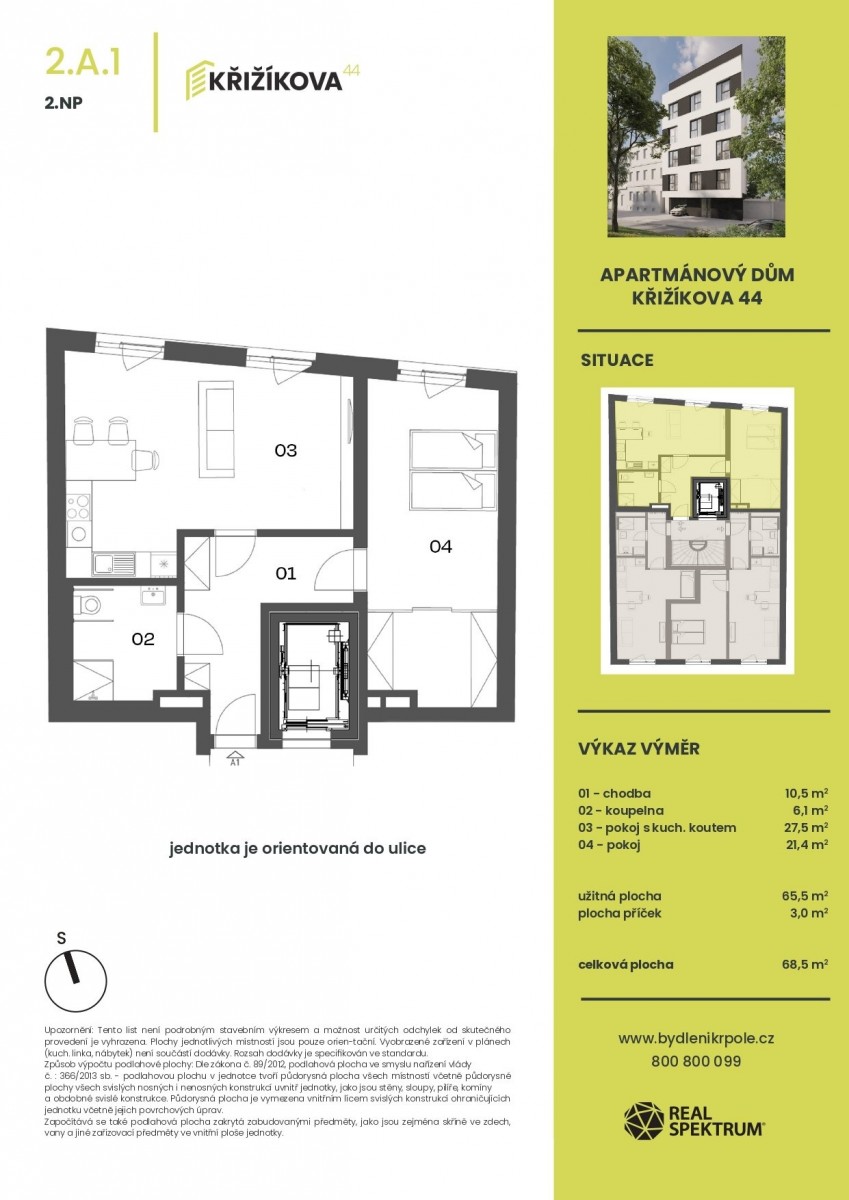 chodba (10, 5 m²), obývací pokoj s kuchyňským koutem (27, 5 m²), pokoj (21, 4 m²), koupelna s sociální zařízení WC (6, 1 m²), sklep