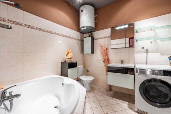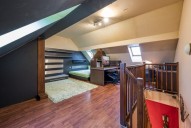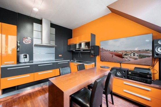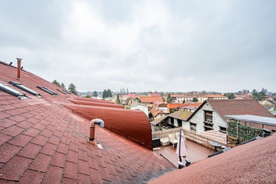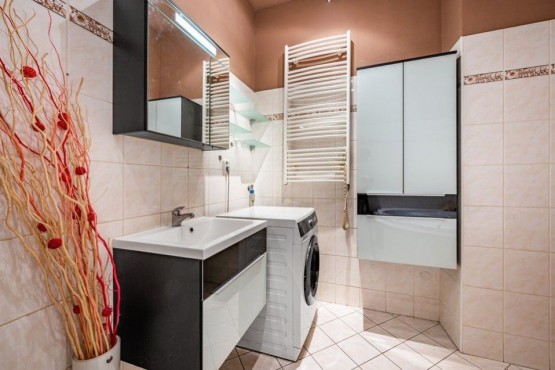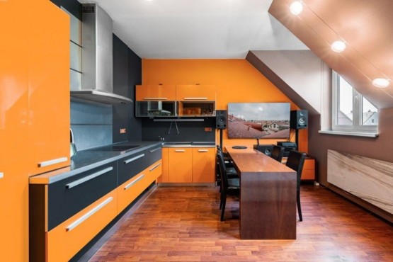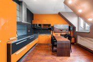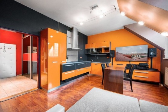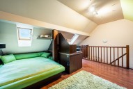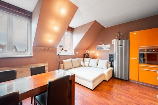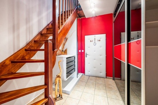 Dispozici bytu tvoří ve spodním patře prostorná vstupní hala, obývací pokoj s kuchyňským a jídelním koutem a koupelna s rohovou vanou, sociální zařízení WC a pračkou se sušičkou. V podkroví se nachází ložnice s pracovnou. V obou patrech je dostatek úložných prostor, nábytek byl vyrobený na míru. Podlahy plovoucí a dlažba, okna a interiérové schody jsou dřevěné. Dům má novou zateplenou fasádu, kamerové zabezpečení, vstup na čip, rezidentům je k dispozici společná kolárna a také venkovní vyhrazené parkování u domu.