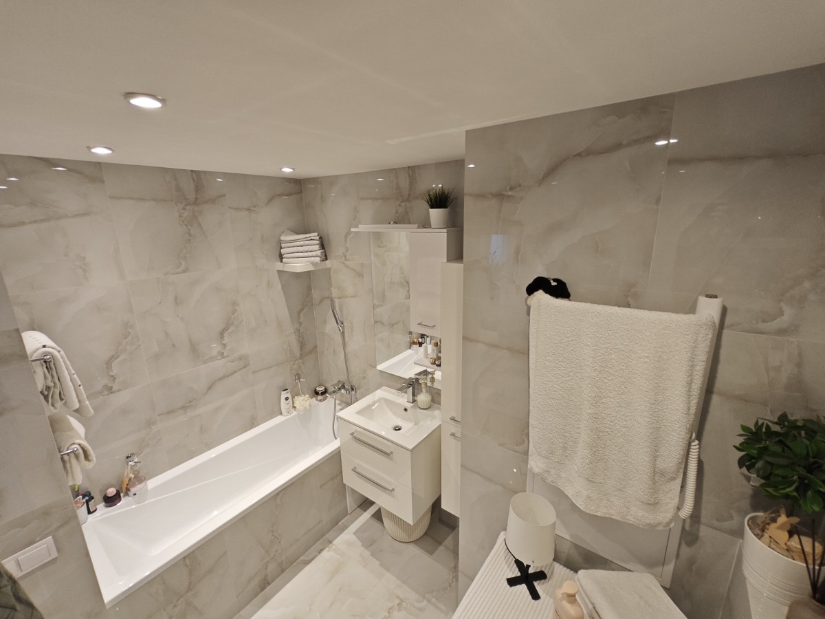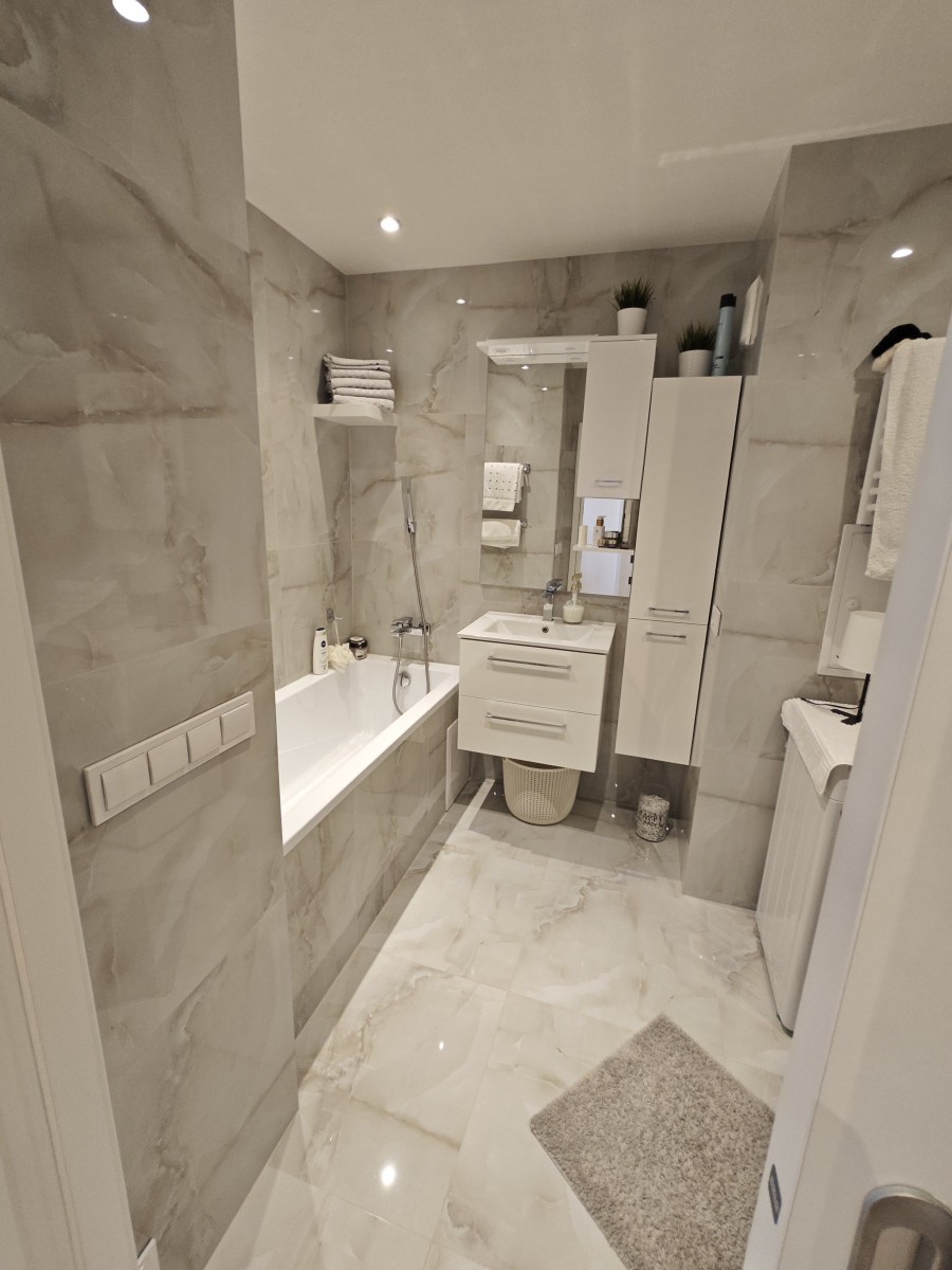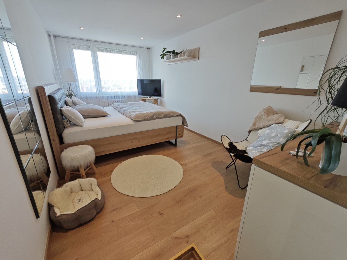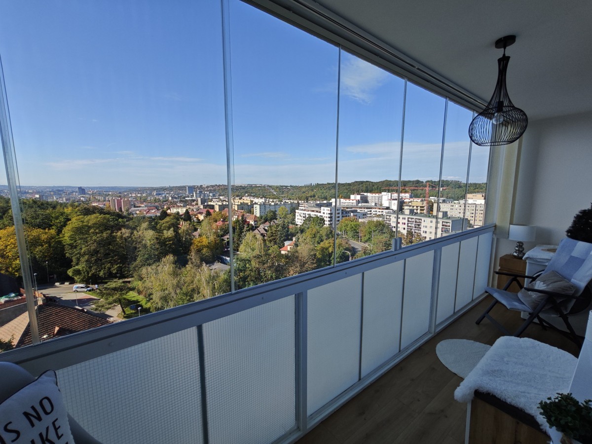 Nabízíme Vám k prodeji slunný, moc hezký družstevní byt o dispozici 2+k+šatna(možno i jako 3+kk), o podlahové ploše 67m²(+lodžie a sklep), který se nachází v 7. podlaží revit...alizovaného panelového domu v Praze v ulici Slévačská. Byt disponuje vstupní halou, která spojuje dva prostorné pokoje( z jednoho vstup na zasklenou lodžii), koupelnu a šatnu. K bytu náleží prostorná zasklená lodžie 6, 5m² s nádherným výhledem na panorama Prahy. Byt je po kompletní atypické náročné rekonstrukci( původně 3+kk), za více než 1mil. /Kč, která zahrnuje kompletní elektroinstalaci v celém bytě, nové podlahy, nová koupelna, nová rohová kuchyně zhotovená na míru, včetně značkových spotřebičů, nové podhledy, stropní bodová světla po celém bytě apod. , vše je téměř nové nepoužité. V šatně se nachází vestavné bílé skříně s velkým množstvím úložných prostor a zrcadlová stěna. V každém pokoji je připravena elektroinstalace pro TV, internetové připojení atd. Okna v celém bytě jsou situována severozápadně a osazena vnitřními žaluziemi, po celé délce lodžie se nachází zasklení a vertikální žaluzie pro zastínění. Součástí bytu jsou nové posuvné dveře zabudované ve stěně pro dostatek prostoru. V koupelně se nachází vana, toaleta( Geberit) též přípojka na pračku. Součástí bytu je zděný sklep o velikosti 2, 5m2. Dům prošel kompletní revitalizací (zateplení, nová plastová okna, nová střecha, nyní nové rozvody plynu a stoupačky (vertikální svody)) a disponuje čtyřmi výtahy. Přímo před vstupem do domu se nachází parkoviště, v pěší dostupnosti MHD (metro - Hloubětín, Rajská zahrada, tramvaj - sídliště Lehovec) a autobus. V okolí domu je Kyjský rybník, cyklostezky. školka a škola před domem. Veškerá občanská vybavenost v místě (Kaufland, Penny, lékárna, pošta). Náklady na bydlení činí 4 - 5 tisíc Kč měsíčně. Anuita bytu kompletně splacena. Parkovací stání v suterénu nedalekého bytového domu, k dispozici za poplatek. Byt je ihned k dispozici.