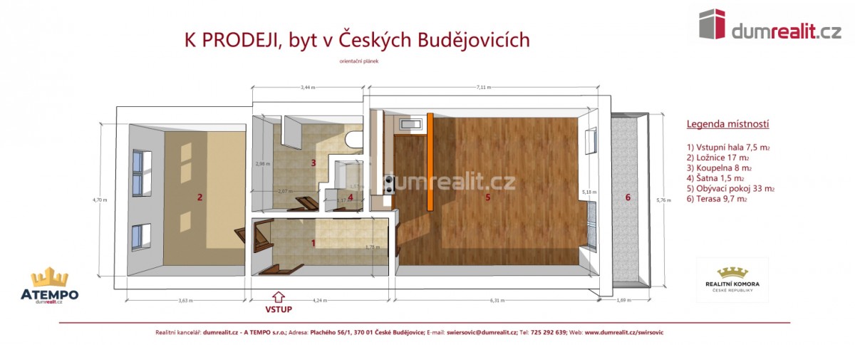 Bezbariérový bytový dům včetně výtahu z roku 2008 o 13 jednotkách se nachází v Otakarově ulici. K bytu náleží vlastní prostorná garáž o velikosti 21 m² s přímým vstupem z garáže do domu + sklep (garáž není součástí kupní ceny, ale nedílnou součástí prodeje), cena garáže je 500. 000, - Kč. Nabízený moderní byt se nachází v 2. patře (3. NP (třetí nadzemní patro)). Ložnice je situována na východní světovou stranu. Obývák s terasou a kuchyňským koutem je situovaný na západní světovou stranu a má moc hezký výhled do vnitrobloku. Byt s plovoucími podlahami je v moc hezkém udržovaném stavu. Bytový dům je kompletně zateplený s plastovými okny. Vytápění je řešeno centrálně plynovým kotlem. Byt je v současné době pronajímán solidním nájemníkům. Podrobnou dispozici bytu naleznete na orientačním plánku mezi fotografiemi. Více info Vám poskytne realitní makléř Zdeněk Swiersovič z RK ATEMPO. Zajistíme Vám financování a veškerý právní servis. Budeme se těšit na prohlídkách. Ev. číslo: 640457. Energetický štítek: C