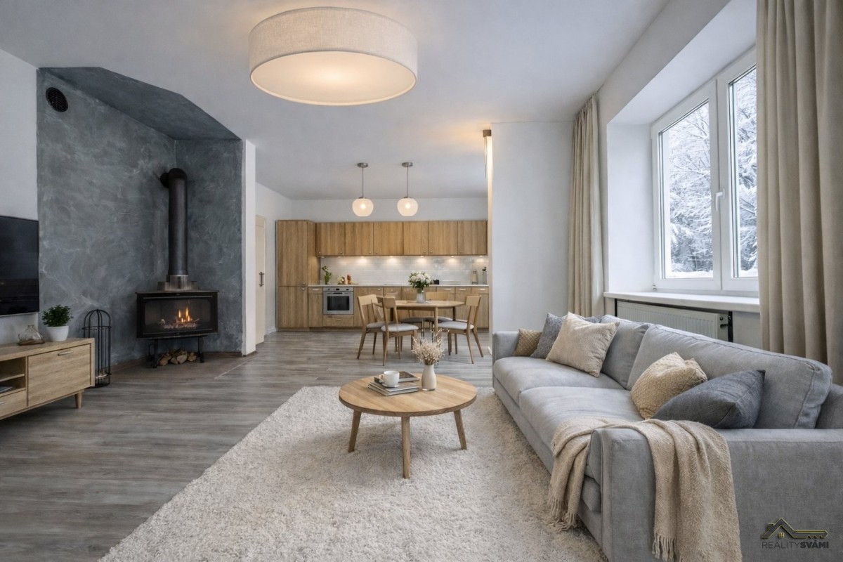 Vytápění je ústřední plynové, při čemž byt má i svá krbová kamna. V bytu jsou plastová okna a elektřina je v mědi.