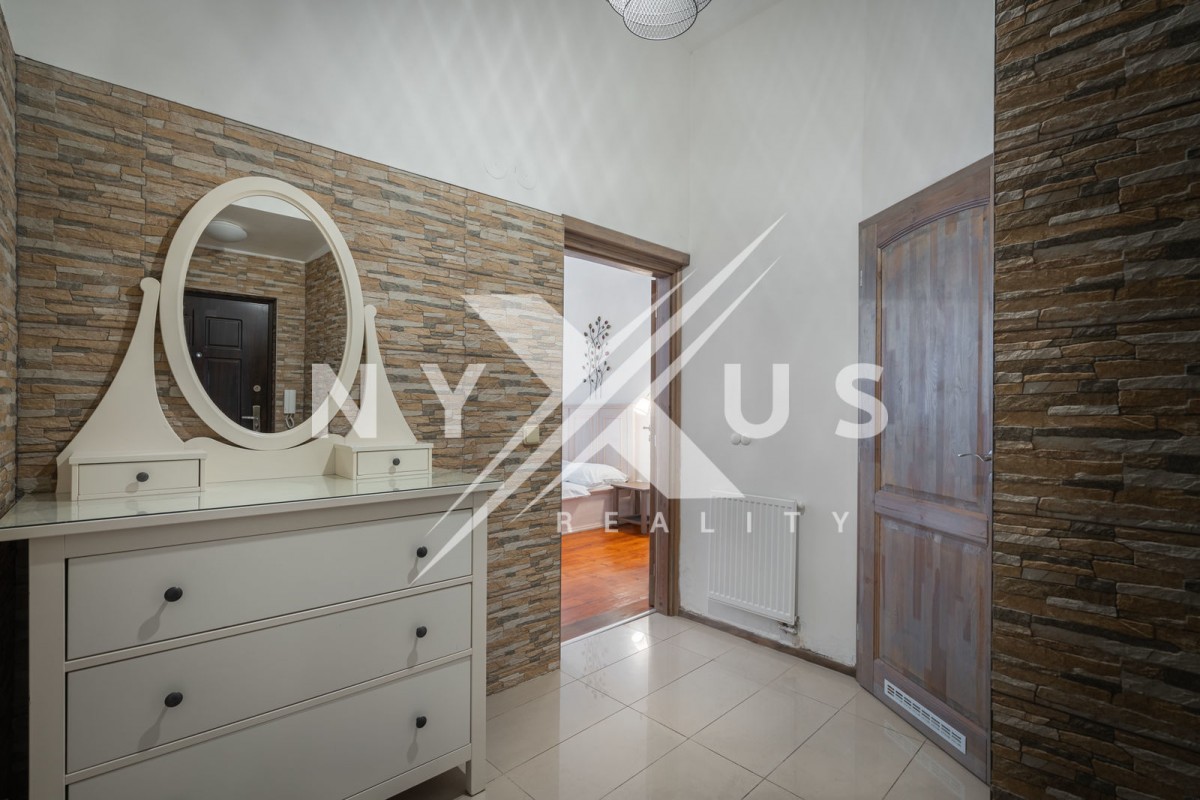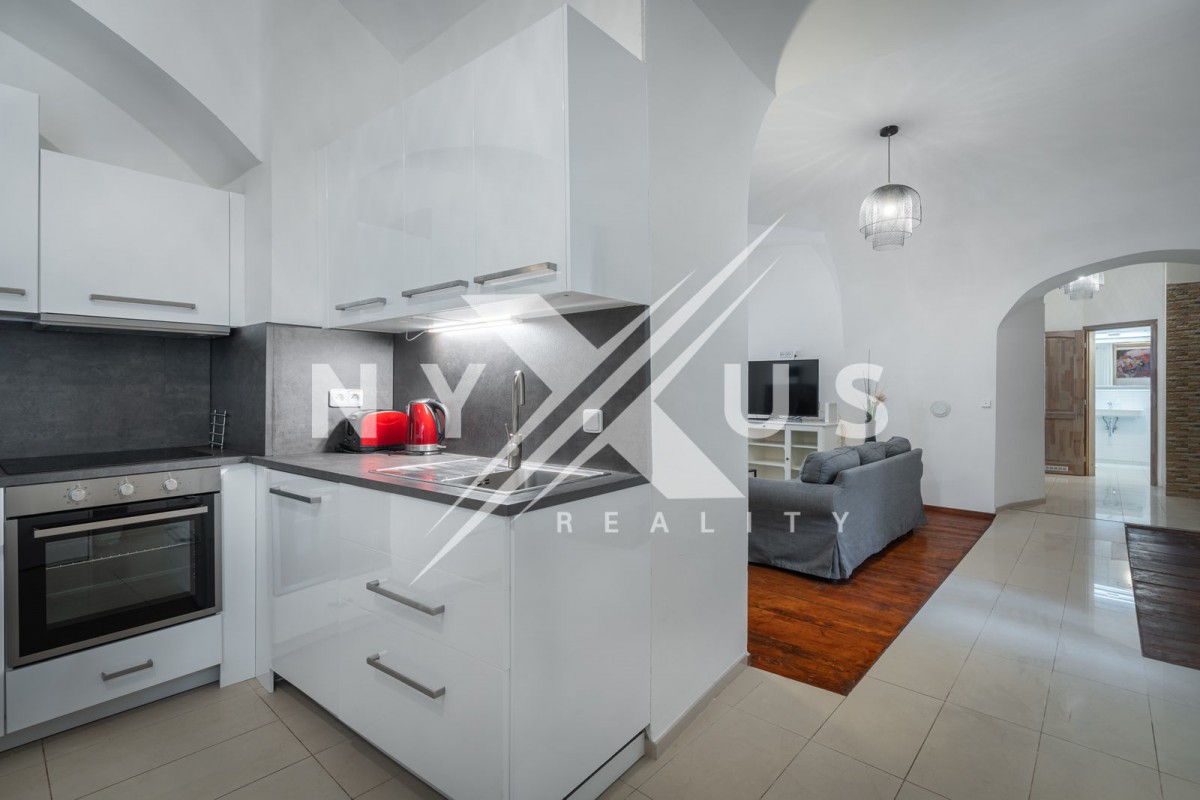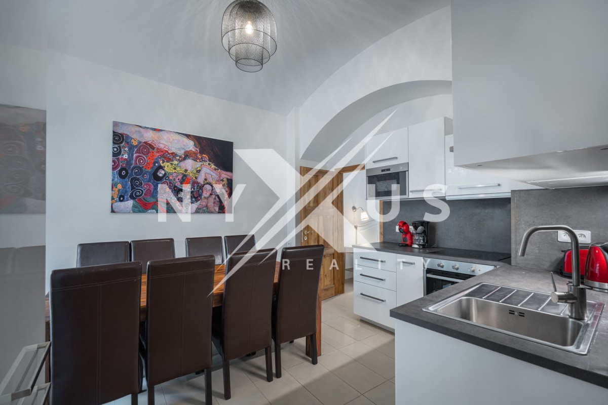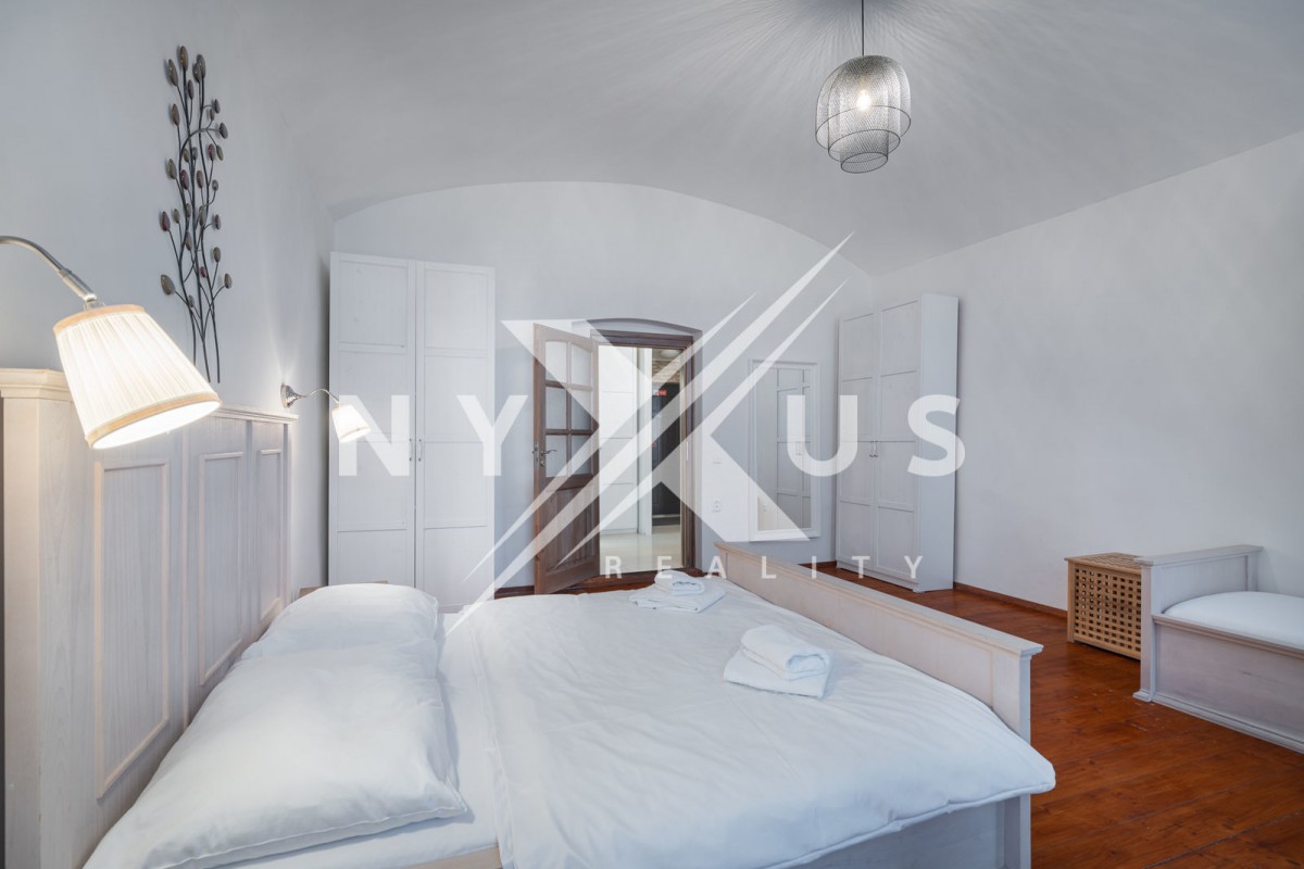 V bytě jsou zachovány původní klenby a jeho rekonstrukce proběhla velice citlivě s ohledem na akcentaci historických prvků. Dřevěné podlahy + dlažba, radiátory s novým kondenzačním kotlem, komín je nově vyvložkován. Nová, kompletně zařízená a vybavená kuchyně včetně velké lednice je v ceně.