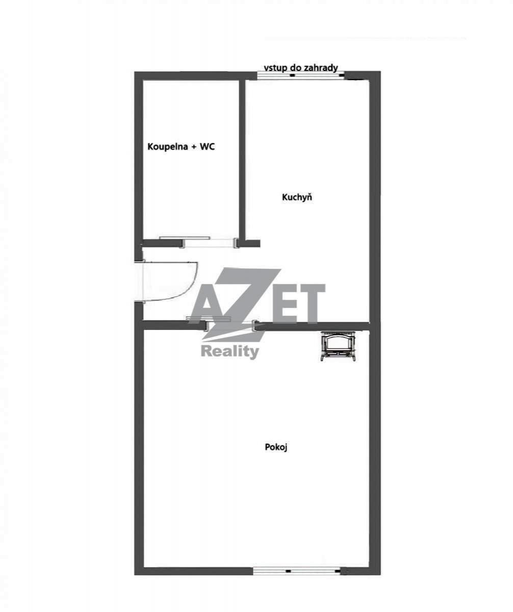 Byt 1+1, pokoj, kuchyň s vchodem na zahradu, koupelna s sociální zařízení WC, zádveří.