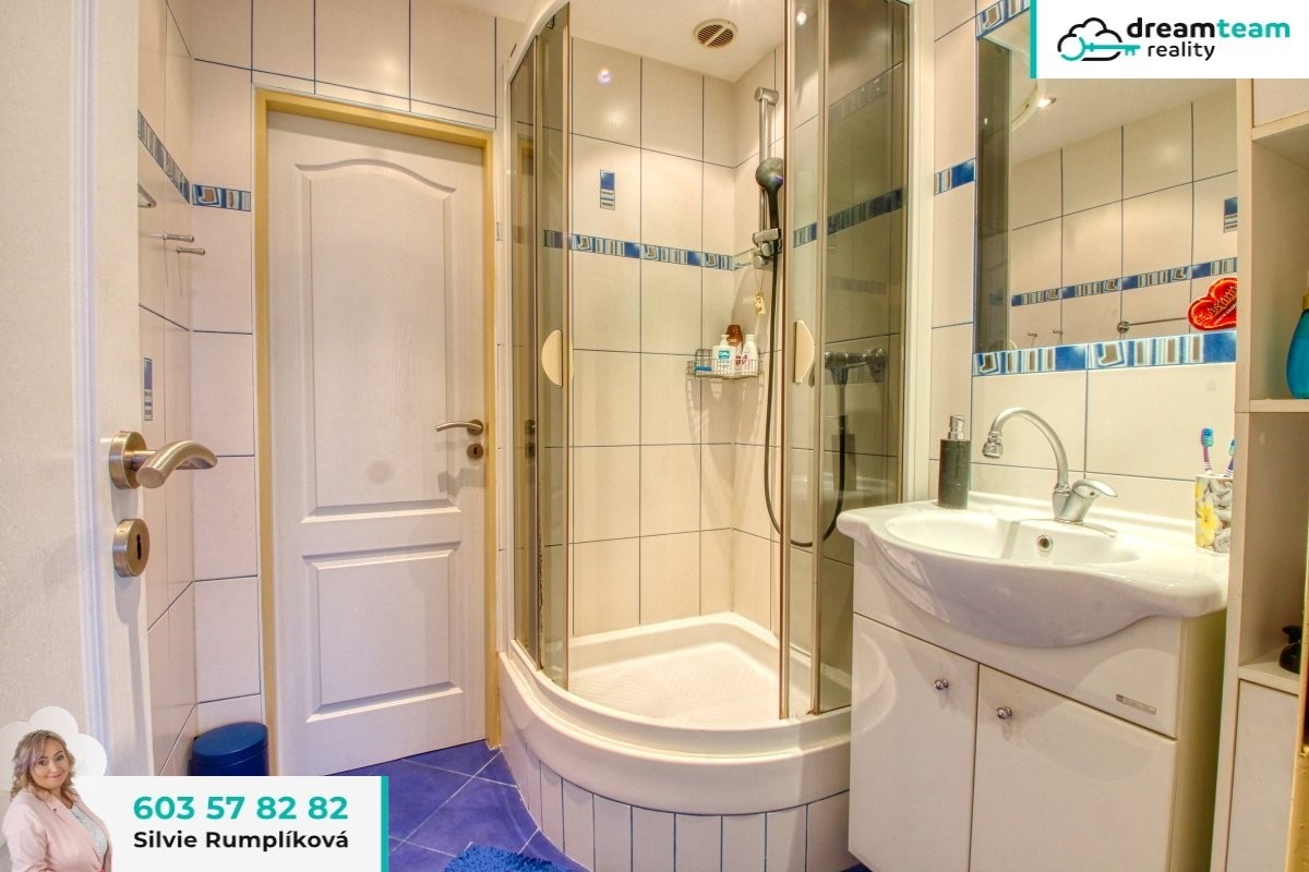 Byt prošel částečnou rekonstrukcí. Poznáte to například v koupelně, kde je zabudován sprchový kout. Podívejte se na fotky, jak se Vám líbí čistá kombinace bílé s modrou. Vedle je umístěno i umyvadlo s úložnou skříňkou a v rohu ještě zůstalo místo na vysokou poličku. Netradičně je zde vyřešen průchod na samostatné sociální zařízení WC, podívejte se na plánek bytu. Díky tomu bývalá chodba našla mnohem lepší využití. Přijďte, ukážu.
