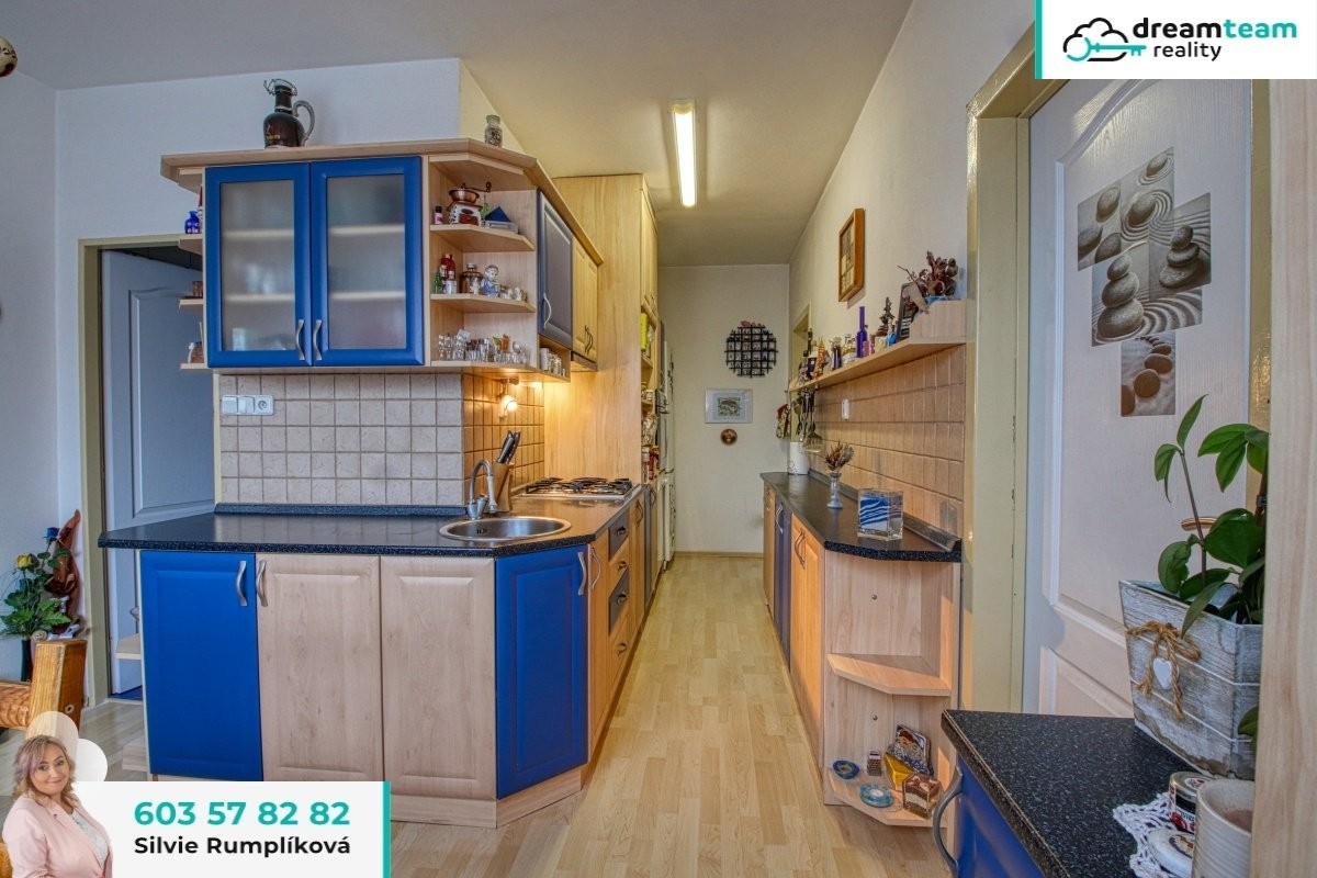 Kuchyně má dostatek úložných i pracovních prostor. Ono to není na fotkách moc vidět, ale vzadu za lednicí je schovaná dokonce i pračka, což mi přijde praktické. Zavolejte ať se sami podíváte, jak je byt řešený. Na kuchyni šikovně navazuje jídelní kout se spižírnou, kam by vešel i mnohem větší stůl, než tam dnes stojí. Díky tomu se nemusí drobit po celém bytě a obývák může sloužit opravdu jen jako obývák s velkou televizí, pohodlnou sedačkou a případně se stolkem na počítač.