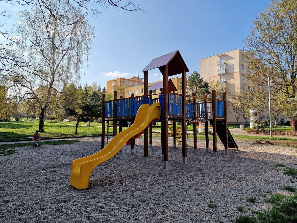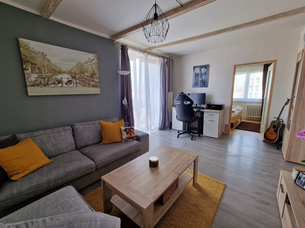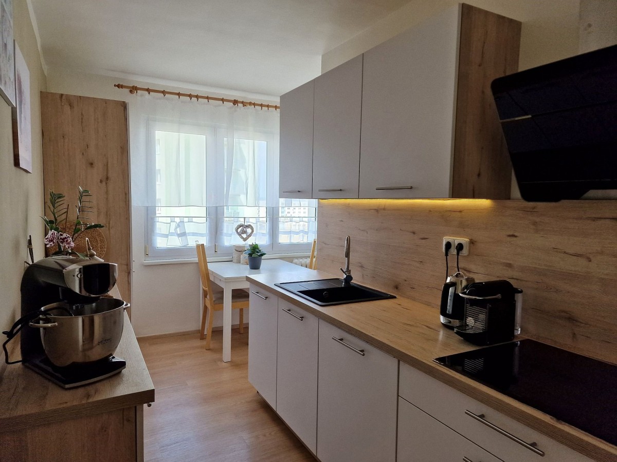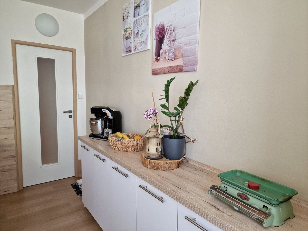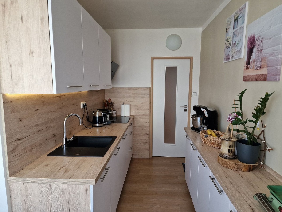 Po vstupu do bytu Vás příjemně překvapí moderní a svěží design bytu. V kuchyni je téměř nová kuchyňská linka, která je vybavena vestavěnými spotřebiči jako je elektrická varná indukční deska, elektrická trouba, myčka na nádobí, vestavěná lednice, digestoř a mnoho úložných prostor důmyslně rozmístěných v kuchyni. V obývacím pokoji je vstup na balkon o velikosti cca 2, 3 m2 s výhledem na město, kde je možné trávit chvíle relaxace a odpočinku. Do ložnice se vchází z obývacího pokoje. Dětský pokoj má samostatným vstup z předsíně. V modernizované koupelně se sprchovým koutem, toaletou a umyvadlem je místo i pro pračku se sušičkou. Ve vstupní předsíni je dostatek místa pro šatní skříň, věšák, zrcadlo atd. Podlahu v bytě kryje vinylová podlaha nebo dlažba.