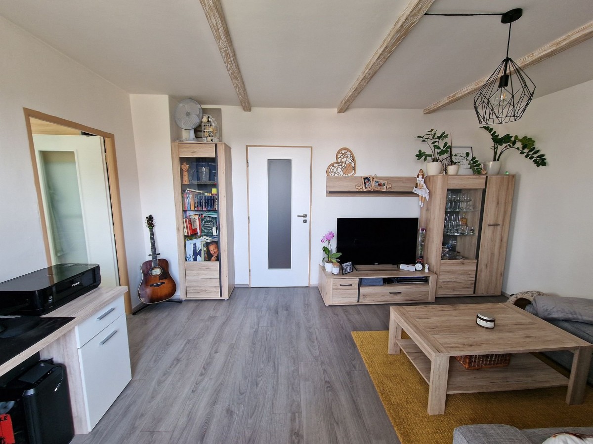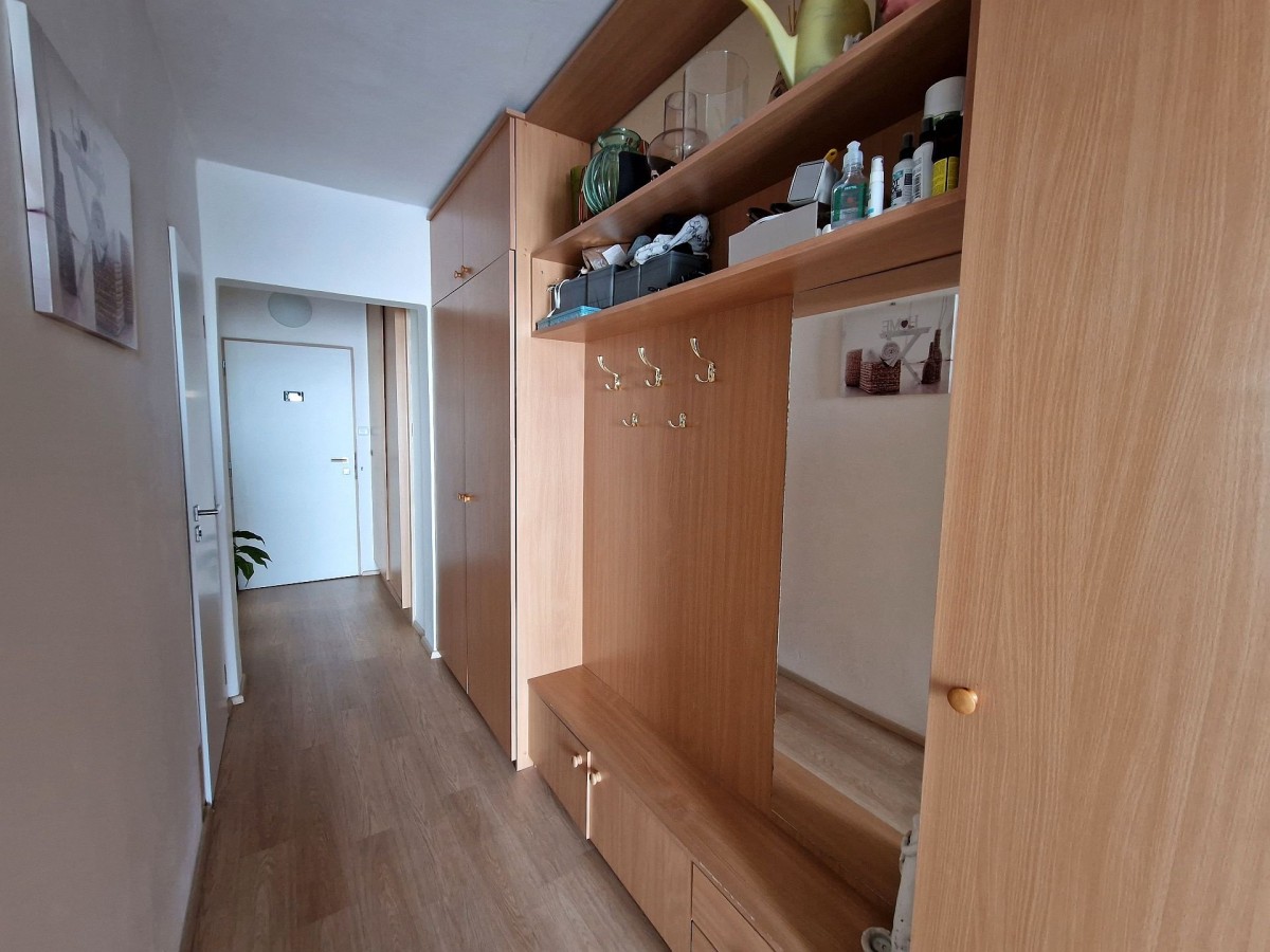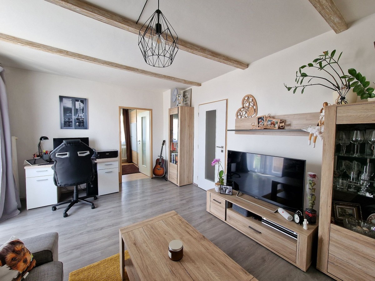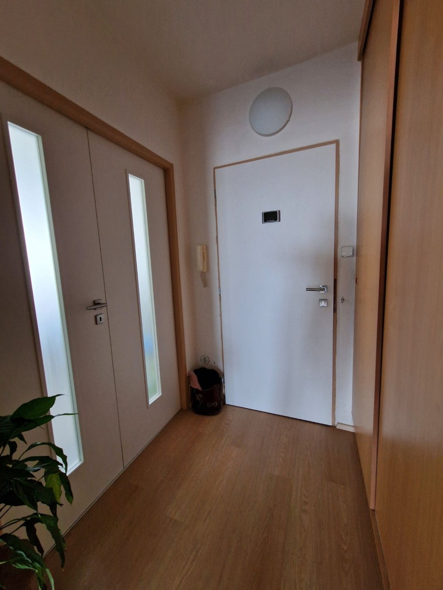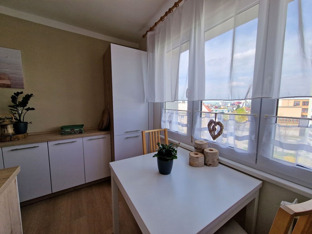 Po vstupu do bytu Vás příjemně překvapí moderní a svěží design bytu. V kuchyni je téměř nová kuchyňská linka, která je vybavena vestavěnými spotřebiči jako je elektrická varná indukční deska, elektrická trouba, myčka na nádobí, vestavěná lednice, digestoř a mnoho úložných prostor důmyslně rozmístěných v kuchyni. V obývacím pokoji je vstup na balkon o velikosti cca 2, 3 m2 s výhledem na město, kde je možné trávit chvíle relaxace a odpočinku. Do ložnice se vchází z obývacího pokoje. Dětský pokoj má samostatným vstup z předsíně. V modernizované koupelně se sprchovým koutem, toaletou a umyvadlem je místo i pro pračku se sušičkou. Ve vstupní předsíni je dostatek místa pro šatní skříň, věšák, zrcadlo atd. Podlahu v bytě kryje vinylová podlaha nebo dlažba.
